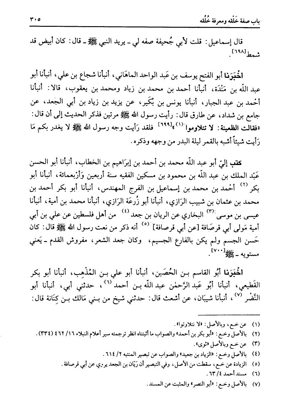 [699] فلقد رأيت وجه رسول الله (صلى الله عليه وسلم) لا يغدر بكم ما رأيت شيئا أشبه بالقمر ليلة البدر من وجهه وذكره كتب إلي أبو عبد الله محمد بن أحمد بن إبراهيم بن الخطاب أنبأنا أبو الحسن عبد الملك بن عبد الله بن محمود بن مسكين الفقيه سنة أربعين وأربعمائة أنبأنا أبو بكر (2) أحمد بن محمد بن إسماعيل بن الفرج المهندس أنبأنا أبو بكر أحمد بن محمد بن عثمان بن شبيب الرازي أنبأنا أبو زرعة الرازي أنبأنا محمد بن أمية أنبأنا عيسى بن موسى (3) البخاري عن الريان بن جعد (4) من أهل فلسطين عن علي بن أبي أمية مولى أبي قرصافة عن أبي قرصافة (5) أنه ذكر من نعت رسول الله (صلى الله عليه وسلم) قال كان حسن الجسم ولم يكن بالفارع الجسيم وكان جعد الشعر مفروش القدم يعني مستويه (صلى الله عليه وسلم)