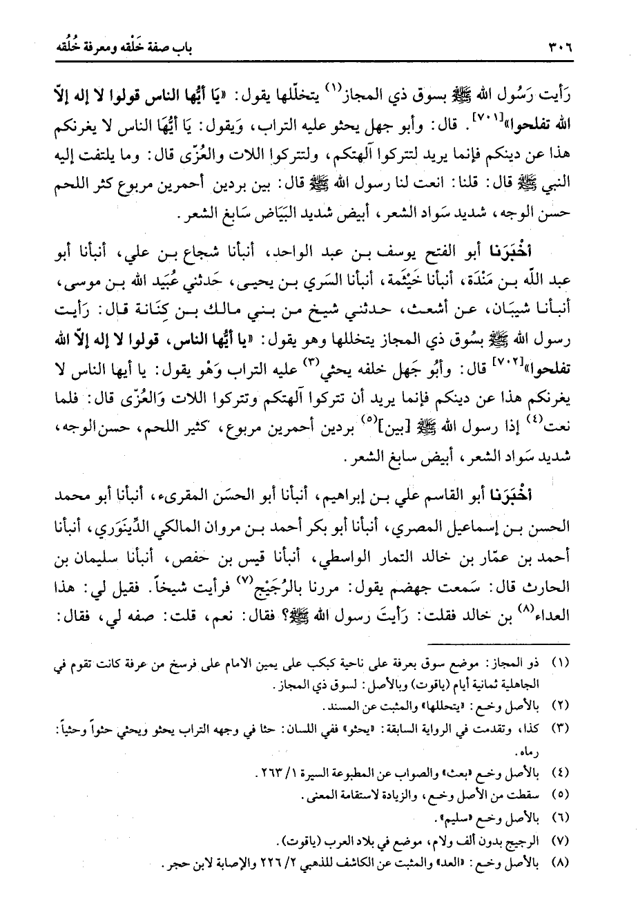 [702] قال وأبو جهل خلفه يحثي (3) عليه التراب وهو يقول يا أيها الناس لا يغرنكم هذا عن دينكم فإنما يريد أن تتركوا آلهتكم وتتركوا اللات والعزى قال فلما نعت (4) إذا رسول الله (صلى الله عليه وسلم) بين (5) بردين أحمرين مربوع كثير اللحم حسن الوجه شديد سواد الشعر أبيض سابغ الشعر أخبرنا أبو القاسم علي بن إبراهيم أنبأنا أبو الحسن المقرئ أنبأنا أبو محمد الحسن بن إسماعيل المصري أنبأنا أبو بكر أحمد بن مروان المالكي الدينوري أنبأنا أحمد بن عمار بن خالد التمار الواسطي أنبأنا قيس بن حفص أنبأنا سليمان بن الحارث قال سمعت جهضم يقول مررنا بالرجيج (7) فرأيت شيخا فقيل لي هذا العداء (8) بن خالد فقلت رأيت رسول الله (صلى الله عليه وسلم) فقال نعم قلت صفه لي فقال