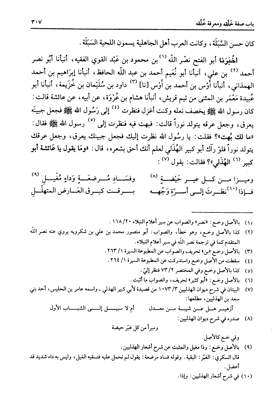 كان حسن السبلة وكانت العرب أهل الجاهلية يسمون اللحية السبلة أخبرنا أبو الفتح نصر الله (1) بن محمود بن عبد القوي الفقيه أنبأنا أبو نصر أحمد (2) بن علي أنبأنا أبو نعيم أحمد بن عبد الله الحافظ أنبأنا إبراهيم بن أحمد الهمذاني أنبأنا أوس بن أحمد بن أوس نا (3) داود بن سليمان بن خزيمة أنبأنا أبو عبيدة معمر بن المثنى من تيم قريش أنبأنا هشام بن عروة عن أبيه عن عائشة قالت كان رسول الله (صلى الله عليه وسلم) يخصف نعله وكنت أغزل فنظرت (4) إلى رسول الله (صلى الله عليه وسلم) فجعل جبينه يعرق وجعل عرقه يتولد نورا قالت فبهت فيه فنظرت إلى (5) رسول الله (صلى الله عليه وسلم) فقال ما لك بهت فقلت يا رسول الله نظرت إليك فجعل جبينك يعرق وجعل عرقك يتولد نورا فلو رآك أبو كبير الهذلي لعلم أنك أحق بشعره قال وما يقول يا عائشة أبو كبير (6) الهذلي فقالت يقول (7) وميزا من كل عير حيضة (8) * وفساد مرضعة وداء مغيل (9) فإذا (10) نظرت إلى أسرة وجهه * برقت كبرق العارض المتهلل *