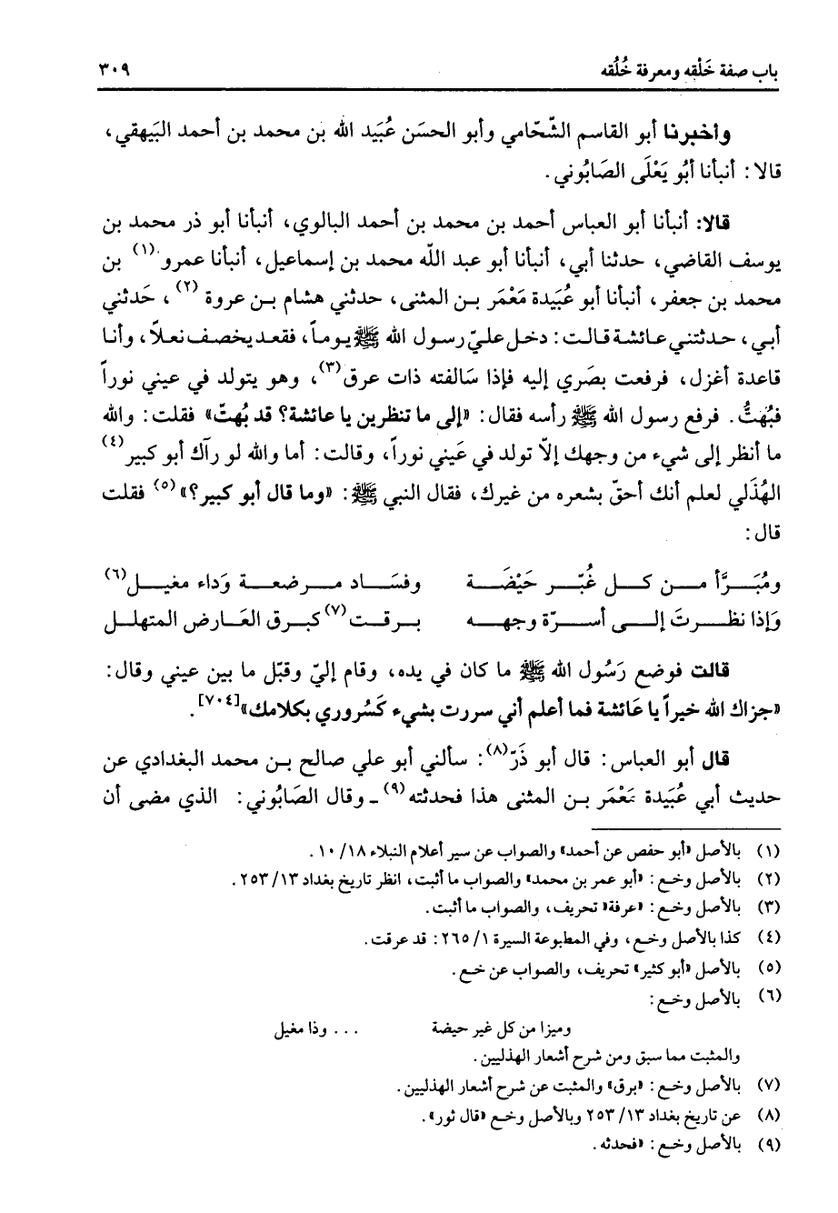 وأخبرنا أبو القاسم الشحامي وأبو الحسن عبيد الله بن محمد بن أحمد البيهقي قالا أنبأنا أبو يعلى الصابوني قالا أنبأنا أبو العباس أحمد بن محمد بن أحمد البالوي أنبأنا أبو ذر محمد بن يوسف القاضي حدثنا أبي أنبأنا أبو عبد الله محمد بن إسماعيل أنبأنا عمرو (1) بن محمد بن جعفر أنبأنا أبو عبيدة معمر بن المثنى حدثني هشام بن عروة (2) حدثني أبي حدثتني عائشة قالت دخل علي رسول الله (صلى الله عليه وسلم) يوما فقعد يخصف نعلا وأنا قاعدة أغزل فرفعت بصري إليه فإذا سالفته ذات عرق (3) وهو يتولد في عيني نورا فبهت فرفع رسول الله (صلى الله عليه وسلم) رأسه فقال إلى ما تنظرين يا عائشة قد بهت فقلت والله ما أنظر إلى شئ من وجهك إلا تولد في عيني نورا وقالت أما والله لو رأك أبو كبير (4) الهذلي لعلم أنك أحق بشعره من غيرك فقال النبي (صلى الله عليه وسلم) وما قال أبو كبير (5) فقلت قال ومبرأ من كل غبر حيضة * وفساد مرضعة وداء مغيل (6) وإذا نظرت إلى أسرة وجهه * برقت (7) كبرق العارض المتهلل * قالت فوضع رسول الله (صلى الله عليه وسلم) ما كان في يده وقام إلي وقبل ما بين عيني وقال جزاك الله خيرا يا عائشة فما أعلم أني سررت بشئ كسروري بكلامك