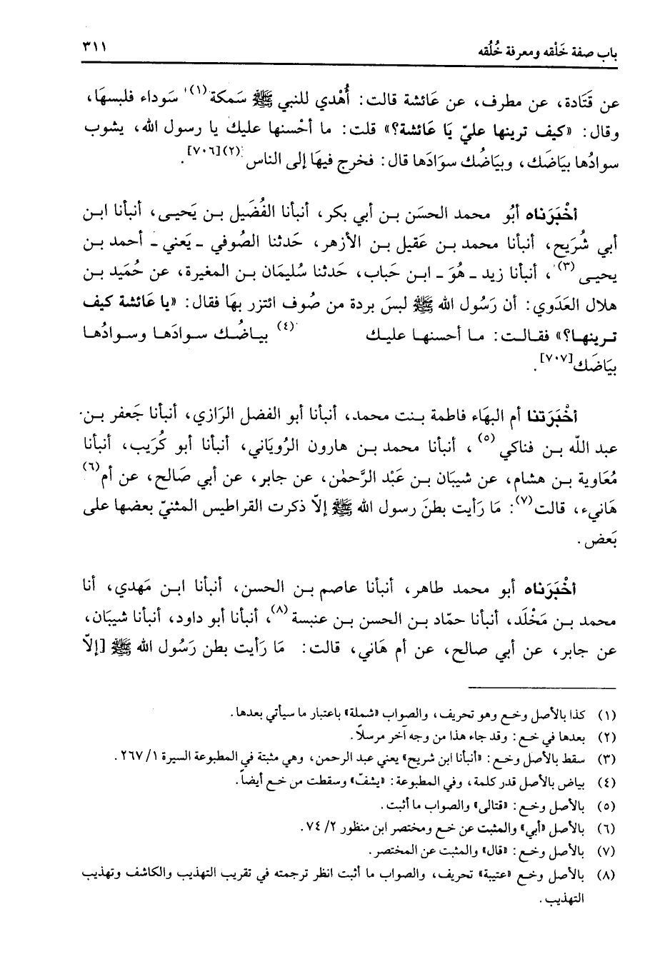 [707] أخبرتنا أم البهاء فاطمة بنت محمد أنبأنا أبو الفضل الرازي أنبأنا جعفر بن عبد الله بن فناكي (5) أنبأنا محمد بن هارون الروياني أنبأنا أبو كريب أنبأنا معاوية بن هشام عن شيبان بن عبد الرحمن عن جابر عن أبي صالح عن أم (6) هانئ قالت (7) ما رأيت بطن رسول الله (صلى الله عليه وسلم) إلا ذكرت القراطيس المثني بعضها على بعض أخبرناه أبو محمد طاهر أنبأنا عاصم بن الحسن أنبأنا ابن مهدي أنا محمد بن مخلد أنبأنا حماد بن الحسن بن عنبسة (8) أنبأنا أبو داود أنبأنا شيبان عن جابر عن أبي صالح عن أم هانئ قالت ما رأيت بطن رسول الله (صلى الله عليه وسلم) إلا