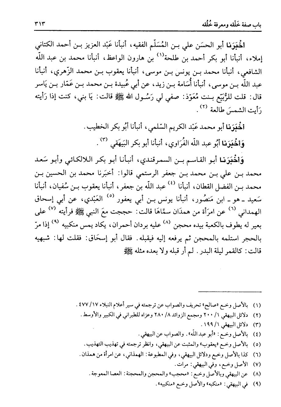 أخبرنا أبو الحسن علي بن المسلم الفقيه أنبأنا عبد العزيز بن أحمد الكتاني إملاء أنبأنا أبو بكر أحمد بن طلحة (1) بن هارون الواعظ أنبأنا محمد بن عبد الله الشافعي أنبأنا محمد بن يونس بن موسى أنبأنا يعقوب بن محمد الزهري أنبأنا عبد الله بن موسى أنبأنا أسامة بن زيد عن أبي عبيدة بن محمد بن عمار بن ياسر قال قلت للربيع بنت معوذ صفي لي رسول الله (صلى الله عليه وسلم) قالت يا بني كنت إذا رأيته رأيت الشمس طالعة (2) أخبرنا أبو محمد عبد الكريم السلمي أنبأنا أبو بكر الخطيب وأخبرنا أبو عبد الله الفراوي أنبأنا أبو بكر البيهقي (3) وأخبرنا أبو القاسم بن السمرقندي أنبأنا أبو بكر اللالكائي وأبو سعد محمد بن علي بن محمد بن جعفر الرستمي قالوا أخبرنا محمد بن الحسين بن محمد بن الفضل القطان أنبأنا (4) عبد الله بن جعفر أنبأنا يعقوب بن سفيان أنبأنا سعيد هو ابن منصور أنبأنا يونس بن أبي يعفور (5) العبدي عن أبي إسحاق الهمداني (6) عن امرأة من همدان سماها قالت حججت مع النبي (صلى الله عليه وسلم) فرأيته (7) على بعير له يطوف بالكعبة بيده محجن (8) عليه بردان أحمران يكاد يمس منكبيه (9) إذا مر بالحجر استلمه بالمحجن ثم يرفعه إليه فيقبله فقال أبو إسحاق فقلت لها شبهيه قالت كالقمر ليلة البدر لم أر قبله ولا بعده مثله (صلى الله عليه وسلم)