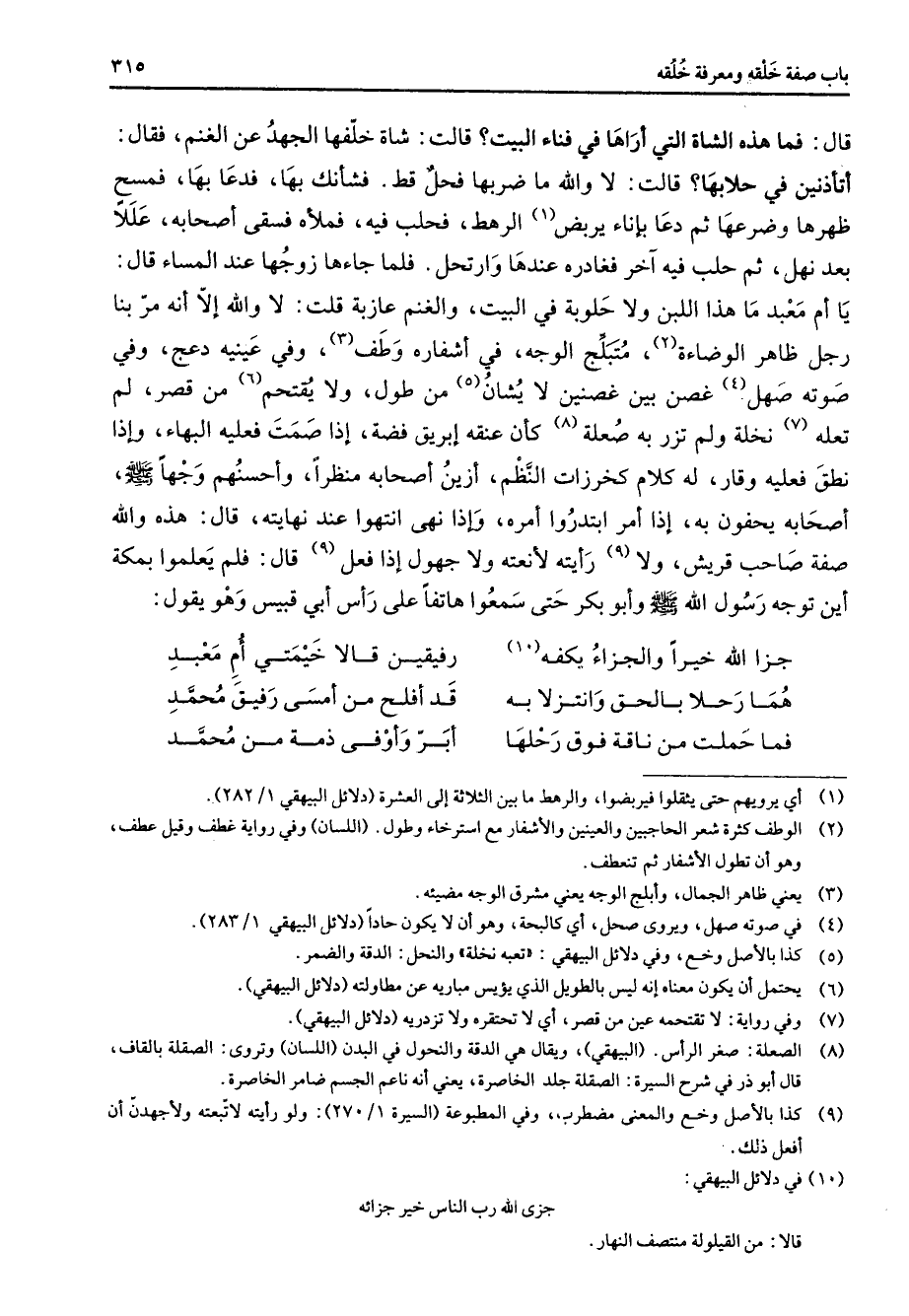 قال فما هذه الشاة التي أراها في فناء البيت قالت شاة خلفها الجهد عن الغنم فقال أتأذنين في حلابها قالت لا والله ما ضربها فحل قط فشأنك بها فدعا بها فمسح ظهرها وضرعها ثم دعا بإناء يربض (1) الرهط فحلب فيه فملأه فسقى أصحابه عللا بعد نهل ثم حلب فيه آخر فغادره عندها وارتحل فلما جاءها زوجها عند المساء قال يا أم معبد ما هذا اللبن ولا حلوبة في البيت والغنم عازبة قلت لا والله إلا أنه مر بنا رجل ظاهر الوضاءة (2) متبلج الوجه في اشفاره وطف (3) وفي عينيه دعج وفي صوته صهل (4) غصن بين غصنين لا يشان (5) من طول ولا يقتحم (6) من قصر لم تعله (7) نخلة ولم تزر به صعلة (8) كأن عنقه إبريق فضة إذا صمت فعليه البهاء وإذا نطق فعليه وقار له كلام كخرزات النظم أزين أصحابه منظرا وأحسنهم وجها (صلى الله عليه وسلم) أصحابه يحفون به إذا أمر ابتدروا أمره وإذا نهى انتهوا عند نهايته قال هذه والله صفة صاحب قريش ولا (9) رأيته لأنعته ولا جهول إذا فعل (9) قال فلم يعلموا بمكة أين توجه رسول الله (صلى الله عليه وسلم) وأبو بكر حتى سمعوا هاتفا على رأس أبي قبيس وهو يقول * جزا الله خيرا والجزاء يكفه (10) * رفيقين قالا خيمتي أم معبد هما رحلا بالحق وانتزلا به * قد أفلح من أمسى رفيق محمد فما حملت من ناقة فوق رحلها * أبر وأوفى ذمة من محمد