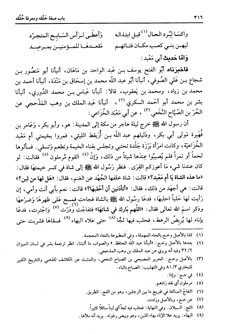 واكسا لبرد الحال (1) قبل ابتذاله * وأعطى لرأس السابح المتجرد ليهن بني كعب مكان فتاتهم * مقعدها للمؤمنين بمرصد * وأما حديث أبي معبد فأخبرناه أبو الفتح يوسف بن عبد الواحد بن ماهان أنبأنا أبو منصور بن شجاع بن علي الصوفي أنبأنا أبو عبد الله محمد بن إسحاق بن مندة أنبأنا أحمد بن محمد بن زياد ومحمد بن يعقوب قالا أنبأنا عباس بن محمد الدوري أنبأنا بشر بن محمد أبو أحمد السكري (2) أنبأنا عبد الملك بن وهب المذحجي عن الحر بن الصياح النخعي (3) عن أبي معبد الخزاعي أن رسول الله (صلى الله عليه وسلم) خرج ليلة هاجر من مكة إلى المدينة هو وأبو بكر وعامر بن فهيرة مولى أبي بكر ودليلهم عبد الله بن أريقط الليثي فمروا بخيمتي أم معبد الخزاعية وكانت امرأة برزة جلدة تحتبي وتجلس بفناء الخيمة وتطعم وتسقي فسألوها لحما أو تمرا فلم يصيبوا عندها شيئا من ذلك وإن (4) القوم مرملون (5) فقالت لو كان عندنا شيئا ما أعوزكم القرى فنظر رسول الله (صلى الله عليه وسلم) إلى شاة في كسر خيمتها فقال ما هذه الشاة يا أم معبد قالت شاة خلفها الجهد عن الغنم فقال هل لها من لبن قالت هي أجهد من ذلك فقال أتأذنين أن أحلبها قالت نعم بأبي أنت وأمي إن رأيت لها حلبا احلبها فدعا رسول الله (صلى الله عليه وسلم) بالشاة فجاءت فمسح على ظهرها وضرعها وذكر اسم الله تعالى فقال اللهم بارك في شاتها فتفاجت (6) ودرت (7) واجترت فدعا بإناء لها يربض الرهط فحلب فيها ثجا (8) حتى علاه البهاء (9) فسقاها فشربت حتى