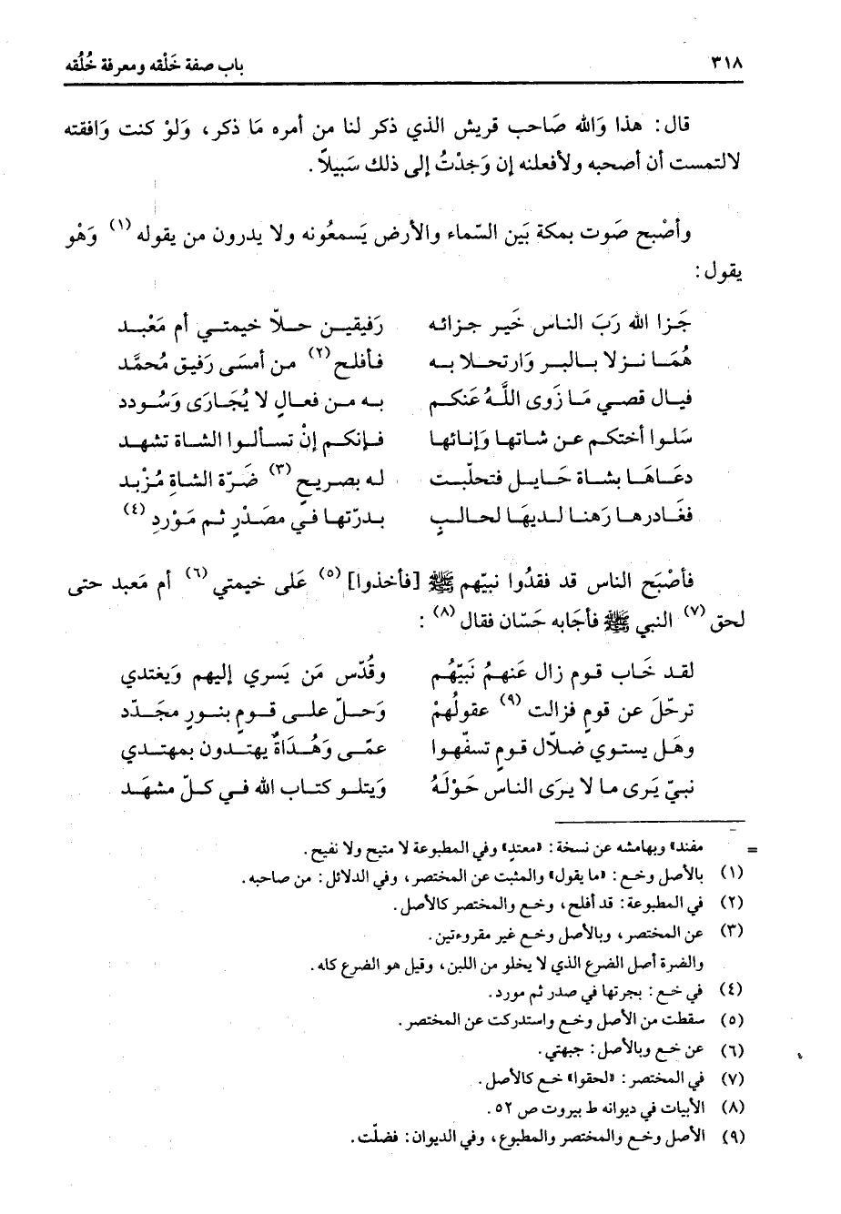 قال هذا والله صاحب قريش الذي ذكر لنا من أمره ما ذكر ولو كنت وافقته لالتمست أن أصحبه ولأفعلنه إن وجدت إلى ذلك سبيلا وأصبح صوت بمكة بين السماء والأرض يسمعونه ولا يدرون من يقوله (1) وهو يقول * جزا الله رب الناس خير جزائه * رفيقين حلا خيمتي أم معبد هما نزلا بالبر وارتحلا به * فأفلح (2) من أمسى رفيق محمد فيال قصي ما زوى الله عنكم * به من فعال لا يجارى وسودد سلوا أختكم عن شاتها وإنائها * فإنكم إن تسألوا الشاة تشهد دعاها بشاة حايل فتحلبت * له بصريح (3) ضرة الشاة مزبد فغادرها رهنا لديها لحالب * بدرتها في مصدر ثم مورد (4) * فأصبح الناس قد فقدوا نبيهم (صلى الله عليه وسلم) فاخذوا (5) على خيمتي (6) أم معبد حتى لحق (7) النبي (صلى الله عليه وسلم) فأجابه حسان فقال (8) * لقد خاب قوم زال عنهم نبيهم * وقدس من يسري إليهم ويغتدي ترحل عن قوم فزالت (9) عقولهم * وحل على قوم بنور مجدد وهل يستوي ضلال قوم تسفهوا * عمى وهداة يهتدون بمهتدي نبي يرى مالا يرى الناس حوله * ويتلو كتاب الله في كل مشهد