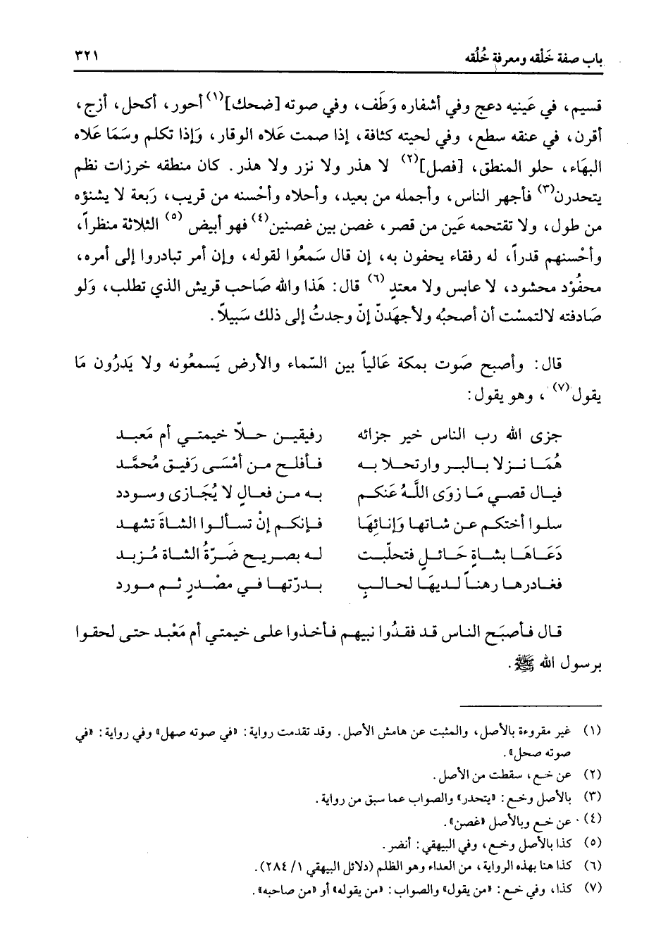 قسيم في عينيه دعج وفي أشفاره وطف وفي صوته ضحك (1) أحور أكحل أزج أقرن في عنقه سطع وفي لحيته كثافة إذا صمت علاه الوقار وإذا تكلم وسما علاه البهاء حلو المنطق فصل (2) لا هذر ولا نزر ولا هذر كان منطقه خرزات نظم يتحدرن (3) فأجهر الناس وأجمله من بعيد وأحلاه وأحسنه من قريب ربعة لا يشنؤه من طول ولا تقتحمه عين من قصر غصن بين غصنين (4) فهو أبيض (5) الثلاثة منظرا وأحسنهم قدرا له رفقاء يحفون به إن قال سمعوا لقوله وإن أمر تبادروا إلى أمره محفود محشود لا عابس ولا معتد (6) قال هذا والله صاحب قريش الذي تطلب ولو صادفته لالتمست أن أصحبه ولأجهدن إن وجدت إلى ذلك سبيلا قال وأصبح صوت بمكة عاليا بين السماء والأرض يسمعونه ولا يدرون ما يقول (7) وهو يقول * جزى الله رب الناس خير جزائه * رفيقين حلا خيمتي أم معبد هما نزلا بالبر وارتحلا به * فأفلح من أمسى رفيق محمد فيال قصي ما زوى الله عنكم * به من فعال لا يجازى وسودد سلوا أختكم عن شاتها وإنائها * فإنكم إن تسألوا الشاة تشهد دعاها بشاة حائل فتحلبت * له بصريح ضرة الشاة مزبد فغادرها رهنا لديها لحالب * بدرتها في مصدر ثم مورد * قال فأصبح الناس قد فقدوا نبيهم فأخذوا على خيمتي أم معبد حتى لحقوا برسول الله (صلى الله عليه وسلم)