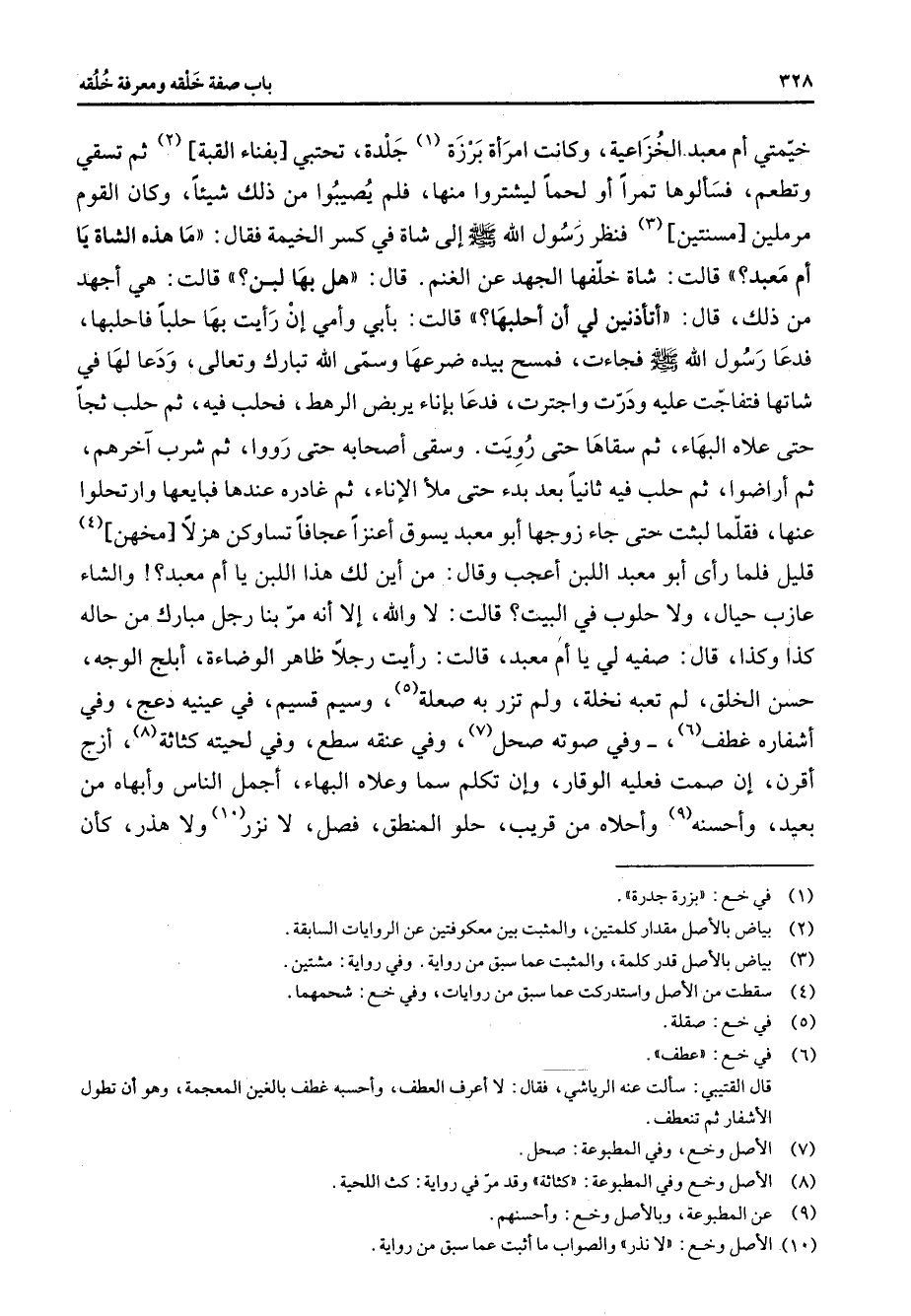 خيمتي أم معبد الخزاعية وكانت امرأة برزة (1) جلدة تحتبي بفناء القبة (2) ثم تسقي وتطعم فسألوها تمرا أو لحما ليشتروا منها فلم يصيبوا من ذلك شيئا وكان القوم مرملين مسنتين (3) فنظر رسول الله (صلى الله عليه وسلم) إلى شاة في كسر الخيمة فقال ما هذه الشاة يا أم معبد قالت شاة خلفها الجهد عن الغنم قال هل بها لبن قالت هي أجهد من ذلك قال أتأذنين لي أن أحلبها قالت بأبي وأمي إن رأيت بها حلبا فاحلبها فدعا رسول الله (صلى الله عليه وسلم) فجاءت فمسح بيده ضرعها وسمى الله تبارك وتعالى ودعا لها في شاتها فتفاجت عليه ودرت واجترت فدعا بإناء يربض الرهط فحلب فيه ثم حلب ثجا حتى علاه البهاء ثم سقاها حتى رويت وسقى أصحابه حتى رووا ثم شرب آخرهم ثم أراضوا ثم حلب فيه ثانيا بعد بدء حتى ملأ الإناء ثم غادره عندها فبايعها وارتحلوا عنها فقلما لبثت حتى جاء زوجها أبو معبد يسوق أعنزا عجافا تساوكن هزلا مخهن (4) قليل فلما رأى أبو معبد اللبن أعجب وقال من أين لك هذا اللبن يا أم معبد والشاء عازب حيال ولا حلوب في البيت قالت لا والله إلا أنه مر بنا رجل مبارك من حاله كذا وكذا قال صفيه لي يا أم معبد قالت رأيت رجلا ظاهر الوضاءة أبلج الوجه حسن الخلق لم تعبه نخلة ولم تزر به صعلة (5) وسيم قسيم في عينيه دعج وفي أشفاره غطف (6) وفي صوته صحل (7) وفي عنقه سطع وفي لحيته كثاثة (8) أزج أقرن إن صمت فعليه الوقار وإن تكلم سما وعلاه البهاء أجمل الناس وأبهاه من بعيد وأحسنه (9) وأحلاه من قريب حلو المنطق فصل لا نزر ولا هذر كأن