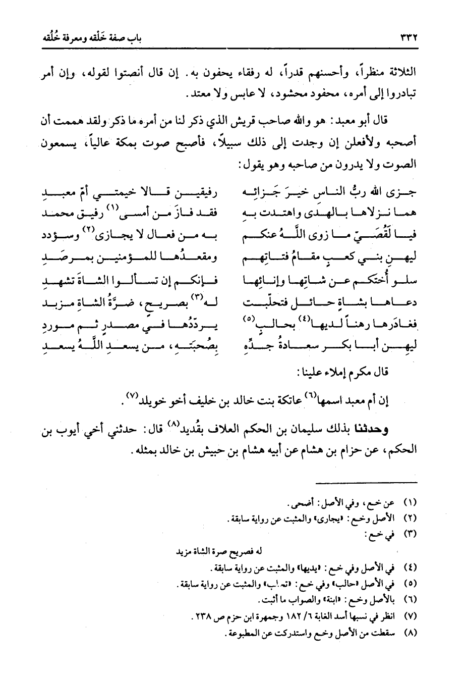 الثلاثة منظرا وأحسنهم قدرا له رفقاء يحفون به إن قال أنصتوا لقوله وإن أمر تبادروا إلى أمره محفود محشود لا عابس ولا معتد قال أبو معبد هو والله صاحب قريش الذي ذكر لنا من أمره ما ذكر ولقد هممت أن أصحبه ولأفعلن إن وجدت إلى ذلك سبيلا فأصبح صوت بمكة عاليا يسمعون الصوت ولا يدرون من صاحبه وهو يقول * جزى الله رب الناس خير جزائه * رفيقين قالا خيمتي أم معبد هما نزلاها بالهدى واهتدت به * فقد فاز من أمسى (1) رفيق محمد فيا / لقصي ما زوى الله عنكم * به من فعال لا يجازى (2) وسؤدد ليهن بني كعب مقام فتاتهم * ومقعدها للمؤمنين بمرصد سلوا أختكم عن شاتها وإنائها * فإنكم إن تسألوا الشاة تشهد دعاها بشاة حائل فتحلبت * له (3) بصريح ضرة الشاة مزبد فغادرها رهنا لديها (4) بحالب (5) * يرددها في مصدر ثم مورد ليهن أبا بكر سعادة جده * بصحبته من يسعد الله يسعد * قال مكرم إملاء علينا إن أم معبد اسمها (6) عاتكة بنت خالد بن خليف أخو خويلد (7) وحدثنا بذلك سليمان بن الحكم العلاف بقديد (8) قال حدثني أخي أيوب بن الحكم عن حزام بن هشام عن أبيه هشام بن حبيش بن خالد بمثله