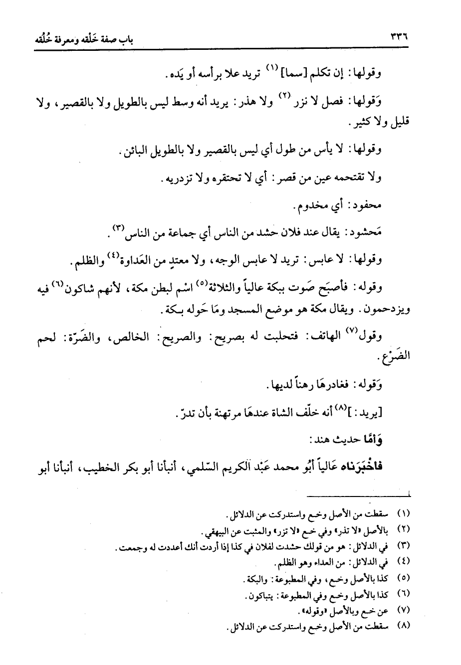 وقولها إن تكلم سما (1) تريد علا برأسه أو يده وقولها فصل لا نزر (2) ولا هذر يريد أنه وسط ليس بالطويل ولا بالقصير ولا قليل ولا كثير وقولها لا يأس من طول أي ليس بالقصير ولا بالطويل البائن ولا تقتحمه عين من قصر أي لا تحتقره ولا تزدريه محفود أي مخدوم محشود يقال عند فلان حشد من الناس أي جماعة من الناس (3) وقولها لا عابس تريد لا عابس الوجه ولا معتد من العداوة (4) والظلم وقوله فأصبح صوت ببكة عاليا والثلاثة (5) اسم لبطن مكة لأنهم شاكون (6) فيه ويزدحمون ويقال مكة هو موضع المسجد وما حوله بكة وقول (7) الهاتف فتحلبت له بصريح والصريح الخالص والضرة لحم الضرع وقوله فغادرها رهنا لديها يريد (8) أنه خلف الشاة عندها مرتهنة بأن تدر وأما حديث هند فأخبرناه عاليا أبو محمد عبد الكريم السلمي أنبأنا أبو بكر الخطيب أنبانا أبو