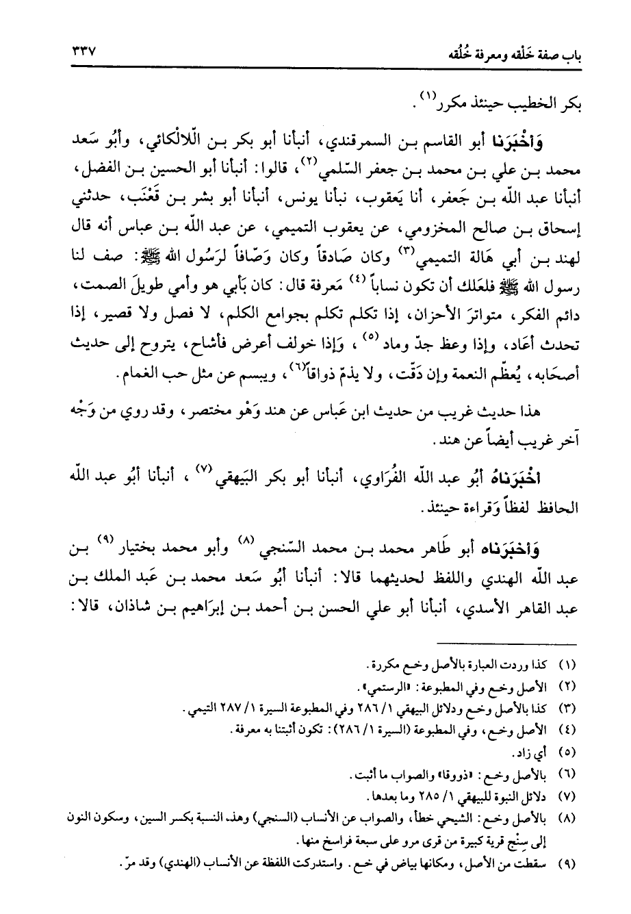 بكر الخطيب حينئذ مكرر (1) وأخبرنا أبو القاسم بن السمرقندي أنبأنا أبو بكر بن اللالكائي وأبو سعد محمد بن علي بن محمد بن جعفر السلمي (2) قالوا أنبأنا أبو الحسين بن الفضل أنبأنا عبد الله بن جعفر أنا يعقوب نبأنا يونس أنبأنا أبو بشر بن قعنب حدثني إسحاق بن صالح المخزومي عن يعقوب التميمي عن عبد الله بن عباس أنه قال لهند بن أبي هالة التميمي (3) وكان صادقا وكان وصافا لرسول الله (صلى الله عليه وسلم) صف لنا رسول الله (صلى الله عليه وسلم) فلعلك أن تكون نسابا (4) معرفة قال كان بأبي هو وأمي طويل الصمت دائم الفكر متواتر الأحزان إذا تكلم تكلم بجوامع الكلم لا فصل ولا قصير إذا تحدث أعاد وإذا وعظ جد وماد (5) وإذا خولف أعرض فأشاح يتروح إلى حديث أصحابه يعظم النعمة وإن دقت ولا يذم ذواقا (6) ويبسم عن مثل حب الغمام هذا حديث غريب من حديث ابن عباس عن هند وهو مختصر وقد روي من وجه آخر غريب أيضا عن هند أخبرناه أبو عبد الله الفراوي أنبأنا أبو بكر البيهقي (7) أنبأنا أبو عبد الله الحافظ لفظا وقراءة حينئذ وأخبرناه أبو طاهر محمد بن محمد السنجي (8) وأبو محمد بختيار (9) بن عبد الله الهندي واللفظ لحديثهما قالا أنبأنا أبو سعد محمد بن عبد الملك بن عبد القاهر الأسدي أنبأنا أبو علي الحسن بن أحمد بن إبراهيم بن شاذان قالا