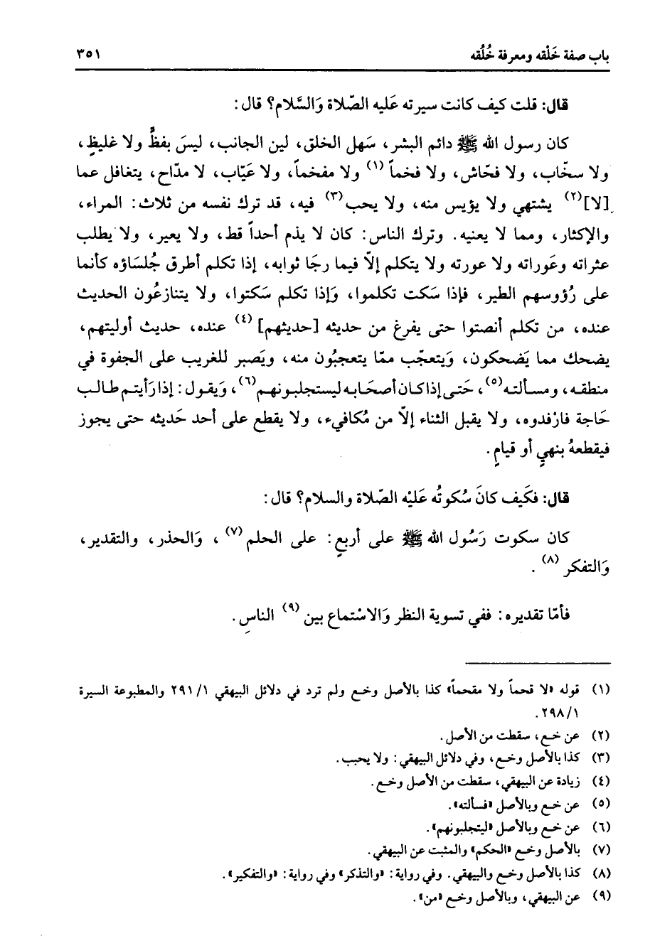 قال قلت كيف كانت سيرته عليه الصلاة والسلام قال كان رسول الله (صلى الله عليه وسلم) دائم البشر سهل الخلق لين الجانب ليس بفظ ولا غليظ ولا سخاب ولا فحاش ولا فخما (1) ولا مفخما ولا عياب لا مداح يتغافل عما لا يشتهي ولا يؤيس منه ولا يحب (3) فيه قد ترك نفسه من ثلاث المراء والإكثار ومما لا يعنيه وترك الناس كان لا يذم أحدا قط ولا يعير ولا يطلب عثراته وعوراته ولا عورته ولا يتكلم إلا فيما رجا ثوابه إذا تكلم أطرق جلساؤه كأنما على رؤوسهم الطير فإذا سكت تكلموا وإذا تكلم سكتوا ولا يتنازعون الحديث عنده من تكلم أنصتوا حتى يفرغ من حديثه حديثهم (4) عنده حديث أوليتهم يضحك مما يضحكون ويتعجب مما يتعجبون منه ويصبر للغريب على الجفوة في منطقه ومسألته (5) حتى إذا كان أصحابه ليستجلبونهم (6) ويقول إذا رأيتم طالب حاجة فارفدوه ولا يقبل الثناء إلا من مكافئ ولا يقطع على أحد حديثه حتى يجوز فيقطعه بنهي أو قيام قال فكيف كان سكوته عليه الصلاة والسلام قال كان سكوت رسول الله (صلى الله عليه وسلم) على أربع على الحلم (7) والحذر والتقدير والتفكر (8) فأما تقديره ففي تسوية النظر والاستماع بين (9) الناس