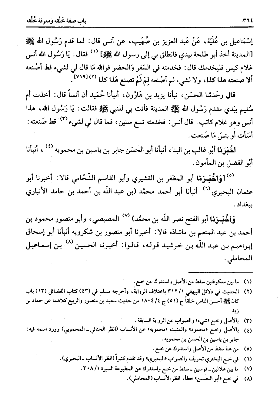 [719] قال وحدثنا الحسن نبأنا يزيد بن هارون أنبأنا حميد أن أنسا قال أخدت أم سليم بيدي مقدم رسول الله (صلى الله عليه وسلم) المدينة فأتت بي للنبي (صلى الله عليه وسلم) فقالت يا رسول الله هذا أنس وهو غلام كاتب قال أنس فخدمته تسع سنين فما قال لي لشئ (3) قط صنعته أسأت أو بئس ما صنعت أخبرنا أبو غالب بن البنا أنبأنا أبو الحسن جابر بن ياسين بن محمويه (4) أنبأنا أبو الفضل بن المأمون (5) وأخبرنا أبو المظفر بن القشيري وأبو القاسم الشحامي قالا أخبرنا أبو عثمان البحيري (6) أنبأنا أبو أحمد محمد بن عبد الله بن أحمد بن حامد الأنباري ببغداد وأخبرنا أبو الفتح نصر الله بن محمد (7) المصيصي وأبو منصور محمود بن أحمد بن عبد المنعم بن ماشاذه قالا أخبرنا أبو منصور بن شكرويه أنبأنا أبو إسحاق إبراهيم بن عبد الله بن خرشيد قوله قالوا أخبرنا الحسين (8) بن إسماعيل المحاملي
