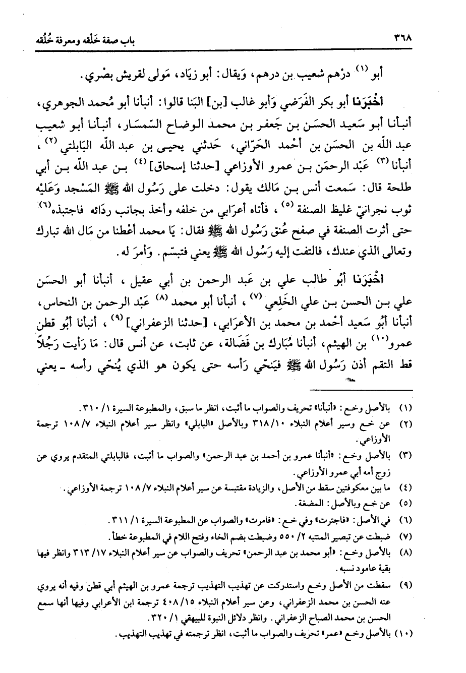 أبو (1) درهم شعيب بن درهم ويقال أبو زياد مولى لقريش بصري أخبرنا أبو بكر الفرضي وأبو غالب بن البنا قالوا أنبأنا أبو محمد الجوهري أنبأنا أبو سعيد الحسن بن جعفر بن محمد الوضاح السمسار أنبأنا أبو شعيب عبد الله بن الحسن بن أحمد الحراني حدثني يحيى بن عبد الله البابلتي (2) أنبأنا (3) عبد الرحمن بن عمرو الأوزاعي حدثنا إسحاق (4) بن عبد الله بن أبي طلحة قال سمعت أنس بن مالك يقول دخلت على رسول الله (صلى الله عليه وسلم) المسجد وعليه ثوب نجراني غليظ الصنفة (5) فأتاه أعرابي من خلفه وأخذ بجانب ردائه فاجتذه (6) حتى أثرت الصنفة في صفح عنق رسول الله (صلى الله عليه وسلم) فقال يا محمد أعطنا من مال الله تبارك وتعالى الذي عندك فالتفت إليه رسول الله (صلى الله عليه وسلم) يعني فتبسم وأمر له أخبرنا أبو طالب علي بن عبد الرحمن بن أبي عقيل أنبأنا أبو الحسن علي بن الحسن بن علي الخلعي (7) أنبأنا أبو محمد (8) عبد الرحمن بن النحاس أنبأنا أبو سعيد أحمد بن محمد بن الأعرابي حدثنا الزعفراني (9) أنبأنا أبو قطن عمرو (10) بن الهيثم أنبأنا مبارك بن فضالة عن ثابت عن أنس قال ما رأيت رجلا قط التقم أذن رسول الله (صلى الله عليه وسلم) فينحي رأسه حتى يكون هو الذي ينحي رأسه يعني