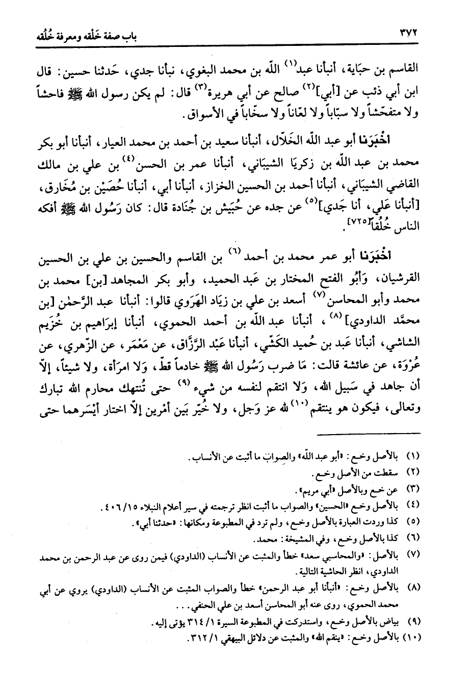القاسم بن حباية أنبأنا عبد (1) الله بن محمد البغوي نبأنا جدي حدثنا حسين قال ابن أبي ذئب عن أبي (2) صالح عن أبي هريرة (3) قال لم يكن رسول الله (صلى الله عليه وسلم) فاحشا ولا متفحشا ولا سبابا ولا لعانا ولا سخابا في الاسواق أخبرنا أبو عبد الله الخلال أنبأنا سعيد بن أحمد بن محمد العيار أنبأنا أبو بكر محمد بن عبد الله بن زكريا الشيباني أنبأنا عمر بن الحسن (4) بن علي بن مالك القاضي الشيباني أنبانا أحمد بن الحسين الخزاز أنبأنا أبي أنبأنا حصين بن مخارق أنبأنا علي أنا جدي (5) عن جده عن حبيش بن جنادة قال كان رسول الله (صلى الله عليه وسلم) أفكه الناس خلقه