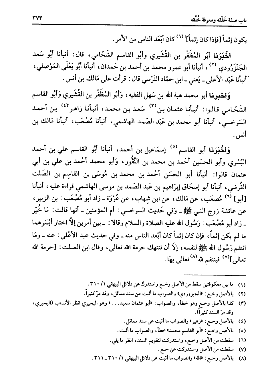 يكون إثما فإذا كان إثما (1) كان أبعد الناس من الأمر أخبرنا أبو المظفر بن القشيري وأبو القاسم الشحامي قال أنبأنا أبو سعد الجنزرودي (2) أنبأنا أبو عمرو محمد بن أحمد بن حمدان أنبأنا أبو يعلى الموصلي أنبأنا عبد الأعلى يعني ابن حماد النرسي قال قرأت على مالك بن أنس وأخبرنا أبو محمد هبة الله بن سهل الفقيه وأبو المظفر بن القشيري وأبو القاسم الشحامي قالوا أنبأنا عثمان بن (3) سعد بن محمد أنبأنا زاهر (4) بن أحمد السرخسي أنبأنا أبو محمد بن عبد الصمد الهاشمي أنبأنا مصعب أنبأنا مالك بن أنس وأخبرنا أبو القاسم (5) إسماعيل بن أحمد أنبأنا أبو القاسم علي بن أحمد البسري وأبو الحسين أحمد بن محمد بن النقور وأبو محمد أحمد بن علي بن أبي عثمان قالوا أنبأنا أبو الحسن أحمد بن محمد بن موسى بن القاسم بن الصلت القرشي أنبانا أبو إسحاق إبراهيم بن عبد الصمد بن موسى الهاشمي قراءة عليه أنبأنا أبو (6) مصعب عن مالك عن ابن شهاب عن عروة زاد أبو مصعب بن الزبير عن عائشة زوج النبي (صلى الله عليه وسلم) وفي حديث السرخسي أم المؤمنين أنها قالت ما خير زاد أبو مصعب رسول الله عليه الصلاة والسلام وقالا بين أمرين إلا اختار أيسرهما ما لم يكن إثما فإن كان إثما كان أبعد الناس منه وفي حديث عبد الأعلى عنه وما انتقم رسول الله (صلى الله عليه وسلم) لنفسه إلا أن تنتهك حرمة الله تعالى وقال ابن الصلت حرمة الله تعالى (7) فينتقم لله (8) تعالى بها