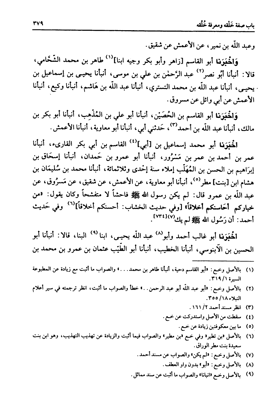 وعبد الله بن نمير عن الأعمش عن شقيق وأخبرنا أبو القاسم زاهر وأبو بكر وجيه ابنا (1) طاهر بن محمد الشحامي قالا أنبأنا أبو نصر (2) عبد الرحمن بن علي بن موسى أنبانا يحيى بن إسماعيل بن يحيى أنبأنا عبد الله بن محمد التستري أنبأنا عبد الله بن هاشم أنبأنا وكيع أنبأنا الأعمش عن أبي وائل عن مسروق وأخبرنا أبو القاسم بن الحصين أنبأنا أبو علي بن المذهب أنبأنا أبو بكر بن مالك أنبأنا عبد الله بن أحمد (3) حدثني أبي أنبأنا أبو معاوية أنبأنا الأعمش أخبرنا أبو محمد إسماعيل بن أبي (4) القاسم بن أبي بكر القارئ أنبأنا عمر بن أحمد بن عمر بن مسرور أنبأنا أبو عمرو بن حمدان أنبأنا إسحاق بن إبراهيم بن الحسن بن المهلب إملاء سنة إحدى وثلاثمائة أنبأنا محمد بن سليمان بن هشام ابن بنت مطر (5) أنبأنا أبو معاوية عن الأعمش عن شقيق عن مسروق عن عبد الله بن عمرو قال لم يكن رسول الله (صلى الله عليه وسلم) فاحشا لا متفحشا وكان يقول من خياركم أحاسنكم أخلاقا (6) وفي حديث الخشاب أحسنكم أخلاقا وفي حديث أحمد أن رسول الله (صلى الله عليه وسلم) لم يك (7)
