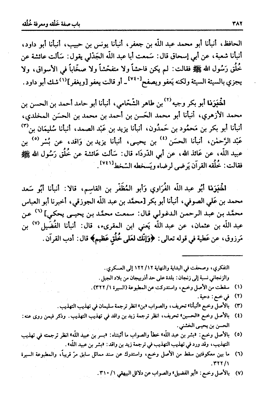 [741] أخبرنا أبو عبد الله الفراوي وأبو المظفر بن القاسم قالا أنبأنا أبو سعد محمد بن علي الصوفي أنبأنا أبو بكر محمد بن عبد الله الجوزقي أخبرنا أبو العباس محمد بن عبد الرحمن الدغولي قال سمعت محمد بن يحيى يحكي (6) عن عبد الله بن عثمان عن عبد الله يعني ابن المقرئ قال أنبأنا الفضيل (7) بن مرزوق عن عطية في قوله تعالى " وإنك لعلى خلق عظيم " قال أدب القرآن