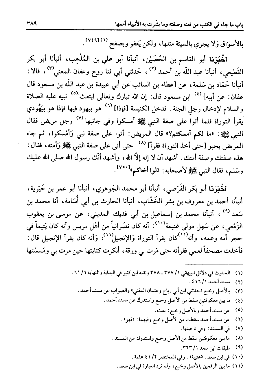 [749] أخبرنا أبو القاسم بن الحصين أنبأنا أبو علي بن المذهب أنبأنا أبو بكر القطيعي أنبأنا عبد الله بن أحمد (2) حدثني أبي ثنا روح وعفان المعني (3) قالا أنبأنا حماد بن سلمة عن عطاء بن السائب عن أبي عبيدة بن عبد الله بن مسعود قال عفان عن أبيه (4) ابن مسعود قال إن الله تبارك وتعالى ابتعث (5) نبيه عليه الصلاة والسلام لإدخال رجل الجنة فدخل الكنيسة فإذا هو بيهود فيها فإذا (6) هو بيهودي يقرأ التوراة فلما أتوا على صفة النبي (صلى الله عليه وسلم) أمسكوا وفي جانبها (7) رجل مريض فقال النبي (صلى الله عليه وسلم) ما لكم أمسكتم قال المريض أتوا على صفة نبي وأمسكوا ثم جاء المريض يحبو حتى أخذ التوراة فقرأ (8) حتى أتى على صفة النبي (صلى الله عليه وسلم) وأمته فقال هذه صفتك وصفة أمتك أشهد أن لا إله إلا الله وأشهد أنك رسول الله صلى الله عليك وسلم فقال النبي (صلى الله عليه وسلم) لأصحابه لوا أخاكم