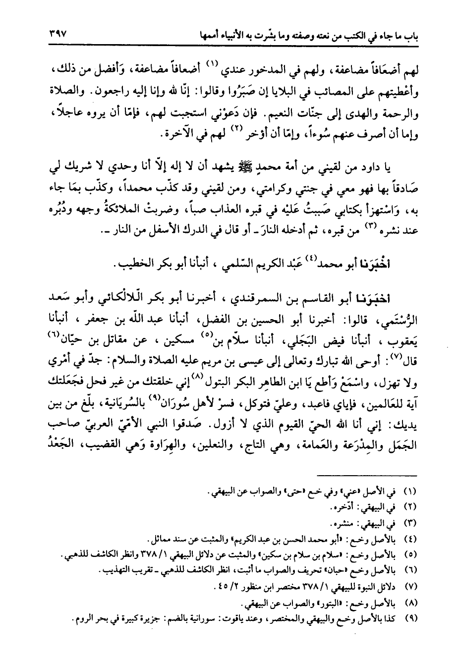 لهم أضعافا مضاعفة ولهم في المدخور عندي (1) أضعافا مضاعفة وأفضل من ذلك وأعطيتهم على المصائب في البلايا إن صبروا وقالوا إن لله وإنا إليه راجعون والصلاة والرحمة والهدى إلى جنات النعيم فإن دعوني استجبت لهم فإما أن يروه عاجلا وإما أن أصرف عنهم سوءا وإما أن أؤخر (2) لهم في الآخرة يا داود من تعيني من أمة محمد (صلى الله عليه وسلم) يشهد أن لا إله إلا أنا وحدي لا شريك لي صادقا بها فهو معي في جنتي وكرامتي ومن لقيني وقد كذب محمدا وكذب بما جاء به واستهزأ بكتابي صببت عليه في قبره العذاب صبا وضربت الملائكة وجهه ودبره عند نشره (3) من قبره ثم أدخله النار أو قال في الدرك الأسفل من النار أخبرنا أبو محمد (4) عبد الكريم السلمي أنبأنا أبو بكر الخطيب أخبرنا أبو القاسم بن السمرقندي أخبرنا أبو بكر اللالكائي وأبو سعد الرستمي قالوا أخبرنا أبو الحسين بن الفضل أنبأنا عبد الله بن جعفر أنبأنا يعقوب أنبأنا فيض البجلي أنبأنا سلام بن (5) مسكين عن مقاتل بن حيان (6) قال (7) أوحى الله تبارك وتعالى إلى عيسى بن مريم عليه الصلاة والسلام جد في أمري ولا تهزل واسمع وأطع يا ابن الطاهر البكر البتول (8) إني خلقتك من غير فحل فجعلتك آية للعالمين فإياي فاعبد وعلي فتوكل فسر لأهل سوران (9) بالسريانية بلغ من بين يديك إني أنا الله الحي القيوم الذي لا أزول صدقوا النبي الأمي العربي صاحب الجمل والمدرعة والعمامة وهي التاج والنعلين والهراوة وهي القضيب الجعد