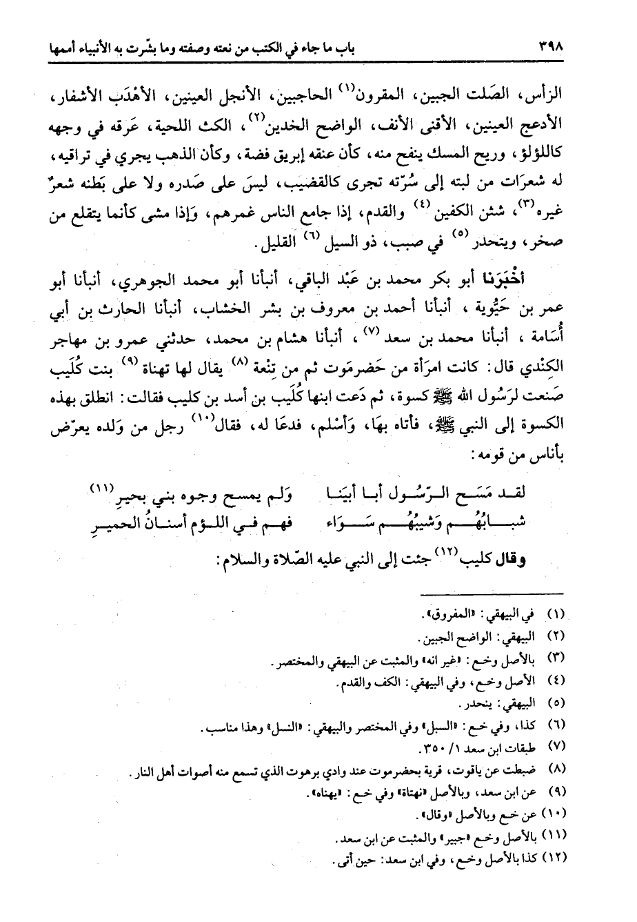 الرأس الصلت الجبين المقرون (1) الحاجبين الأنجل العينين الأهدب الأشفار الأدعج العينين الأقنى الأنف الواضح الخدين (2) الكث اللحية عرقه في وجهه كاللؤلؤ وريح المسك ينفح منه كأن عنقه إبريق فضة وكأن الذهب يجري في تراقيه له شعرات من لبته إلى سرته تجري كالقضيب ليس على صدره ولا على بطنه شعر غيره (3) شثن الكفين (4) والقدم إذا جامع الناس غمرهم وإذا مشى كأنما يتقلع من صخر ويتحدر (5) في صبب ذو السيل (6) القليل أخبرنا أبو بكر محمد بن عبد الباقي أنبانا أبو محمد الجوهري أنبأنا أبو عمر بن حيوية أنبأنا أحمد بن معروف بن بشر الخشاب أنبأنا الحارث بن أبي أسامة أنبأنا محمد بن سعد (7) أنبانا هشام بن محمد حدثني عمرو بن مهاجر الكندي قال كانت امرأة من حضرموت ثم من تنعة (8) يقال لها تهناة (9) بنت كليب صنعت لرسول الله (صلى الله عليه وسلم) كسوة ثم دعت ابنها كليب بن أسد بن كليب فقالت انطلق بهذه الكسوة إلى النبي (صلى الله عليه وسلم) فأتاه بها وأسلم فدعا له فقال (10) رجل من ولده يعرض بأناس من قومه * لقد مسح الرسول أبا أبينا * ولم يمسح وجوه بني بحير (11) شبابهم وشيبهم سواء * فهم في اللؤم أسنان الحمير * وقال كليب (12) جئت إلى النبي عليه الصلاة والسلام *
