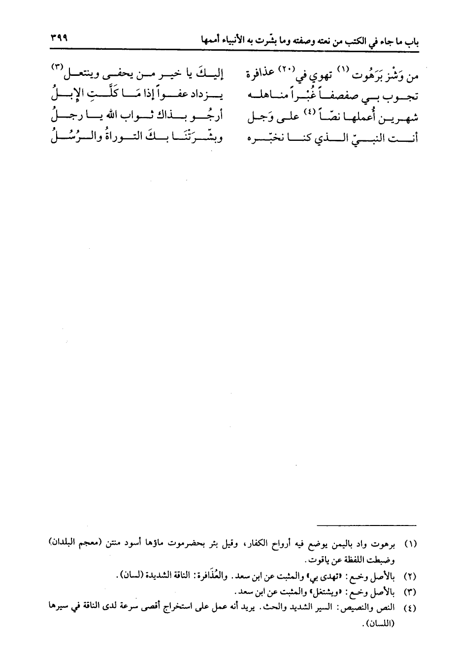 من وشز برهوت (1) تهوي في (2) عذافرة * إليك يا خير من يحفى وينتعل (3) تجوب بي صفصفا غبرا مناهله * يزداد عفوا إذا ما كلت الإبل شهرين أعملها نصا (4) على وجل * أرجو بذاك ثواب الله يا رجل أنت النبي الذي كنا نخبره * وبشرتنا بك التوراة والرسل * "