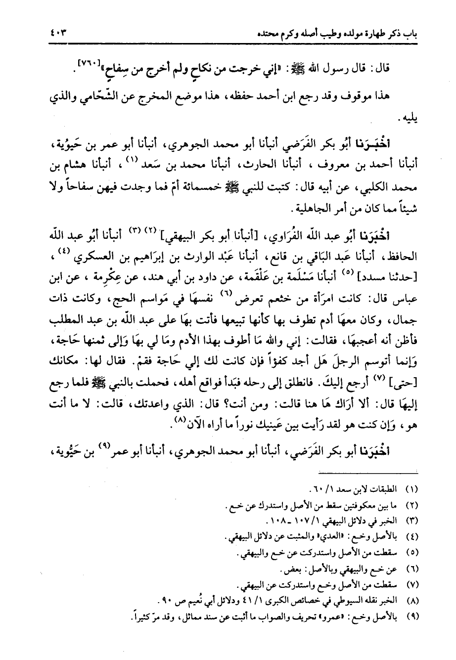 [760] هذا موقوف وقد رجع ابن أحمد حفظه هذا موضع المخرج عن الشحامي والذي يليه أخبرنا أبو بكر الفرضي أنبانا أبو محمد الجوهري أنبأنا أبو عمر بن حيوية أنبأنا أحمد بن معروف أنبأنا الحارث أنبأنا محمد بن سعد (1) أنبأنا هشام بن محمد الكلبي عن أبيه قال كتبت للنبي (صلى الله عليه وسلم) خمسمائة أم فما وجدت فيهن سفاحا ولا شيئا مما كان من أمر الجاهلية أخبرنا أبو عبد الله الفراوي أنبأنا أبو بكر البيهقي (2) (3) أنبأنا أبو عبد الله الحافظ أنبأنا عبد الباقي بن قانع أنبأنا عبد الوارث بن إبراهيم بن العسكري (4) حدثنا مسدد (5) أنبأنا مسلمة بن علقمة عن داود بن أبي هند عن عكرمة عن ابن عباس قال كانت امرأة من خثعم تعرض (6) نفسها في مواسم الحج وكانت ذات جمال وكان معها أدم تطوف بها كأنها تبيعها فأتت بها على عبد الله بن عبد المطلب فأظن أنه أعجبها فقالت إني والله ما أطوف بهذا الأدم وما لي بها وإلى ثمنها حاجة وإنما أتوسم الرجل هل أجد كفؤا فإن كانت لك إلي حاجة فقم فقال لها مكانك حتى (7) أرجع إليك فانطلق إلى رحله فبدأ فواقع أهله فحملت بالنبي (صلى الله عليه وسلم) فلما رجع إليها قال ألا أراك ها هنا قالت ومن أنت قال الذي واعدتك قالت لا ما أنت هو وإن كنت هو لقد رأيت بين عينيك نورا ما أراه الآن (8) أخبرنا أبو بكر الفرضي أنبأنا أبو محمد الجوهري أنبأنا أبو عمر (9) بن حيوية
