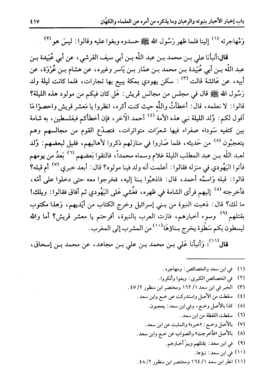 ومهاجرته (1) إلينا فلما ظهر رسول الله (صلى الله عليه وسلم) حسدوه وبغوا عليه وقالوا ليس هو (2) قال أنبأنا علي بن محمد بن عبد الله بن أبي سيف القرشي عن أبي عبيدة بن عبد الله بن أبي عبيدة بن محمد بن عمار بن ياسر وغيره عن هشام بن عروة عن أبيه عن عائشة قالت (3) سكن يهودي بمكة يبيع بها تجارات فلما كانت ليلة ولد رسول الله (صلى الله عليه وسلم) قال في مجلس من مجالس قريش هل كان فيكم من مولود هذه الليلة قالوا لا نعلمه قال أخطأت والله حيث كنت أكره انظروا يا معشر قريش واحصوا ما أقول لكم ولد الليلة نبي هذه الأمة (4) أحمد الآخر فإن أخطأكم فبفلسطين به شامة بين كتفيه سوداء صفراء فيها شعرات متواترات فتصدع القوم من مجالسهم وهم يتعجبون (5) من حديثه فلما صاروا في منازلهم ذكروا لأهاليهم فقيل لبعضهم ولد لعبد الله بن عبد المطلب الليلة غلام وسماه محمدا فالتقوا بعضهم (6) بعد من يومهم فأتوا اليهودي في منزله فقالوا أعلمت أنه ولد فينا مولود قال أبعد خبري (7) أم قبله قالوا قبله واسمه أحمد قال فاذهبوا بنا إليه فخرجوا معه حتى دخلوا على أمه فأخرجته (8) إليهم فرأى الشامة في ظهره فغشي على اليهودي ثم أفاق فقالوا ويلك ما لك قال ذهبت النبوة من بني إسرائيل وخرج الكتاب من أيديهم وهذا مكتوب بقتلهم (9) وسوء أخبارهم فازت العرب بالنبوة أفرحتم يا معشر قريش أما والله ليسطون بكم سطوة يخرج بناؤها (10) من المشرب إلى المغرب قال (11) وأنبأنا علي بن محمد بن علي بن مجاهد عن محمد بن إسحاق