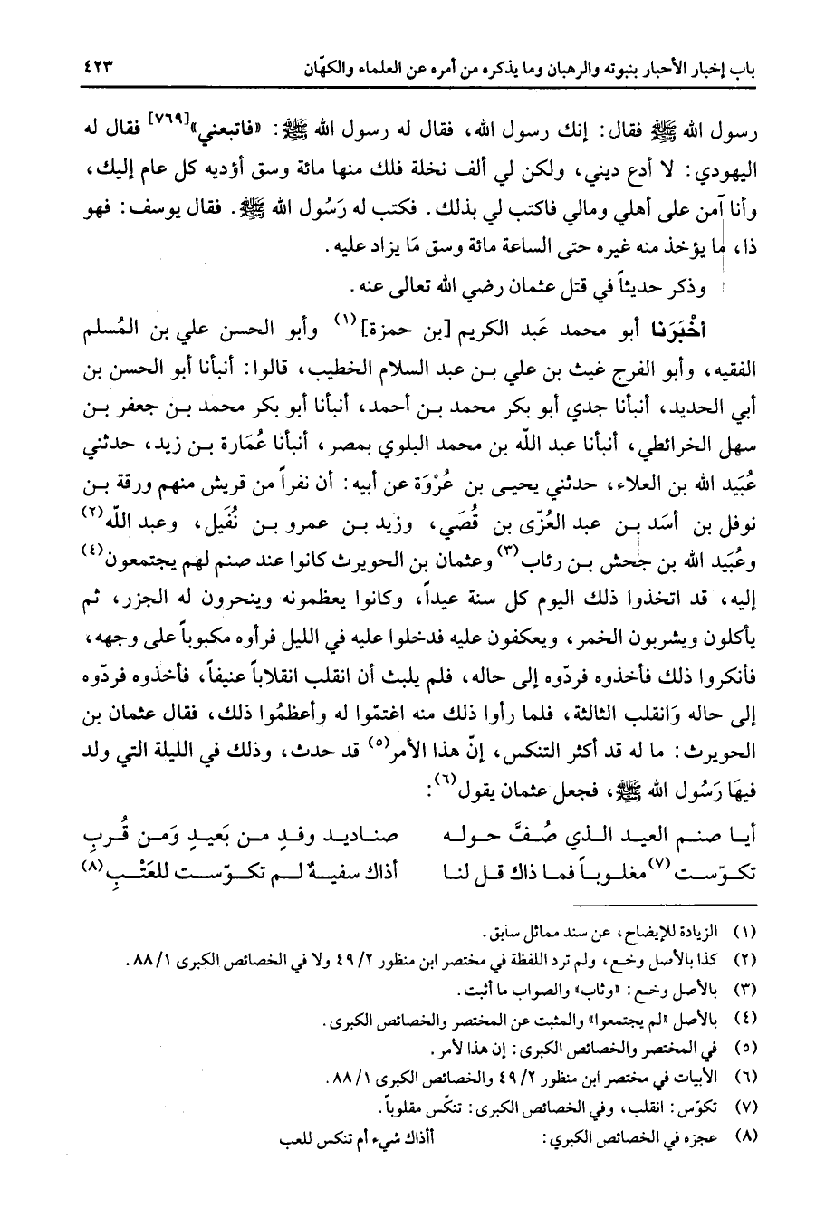 نوفل بن أسد بن عبد العزى بن قصي وزيد بن عمرو بن نفيل وعبد الله (2) وعبيد الله بن جحش بن رئاب (3) وعثمان بن الحويرث كانوا عند صنم لهم يجتمعون (4) إليه قد اتخذوا ذلك اليوم كل سنة عيدا وكانوا يعظمونه وينحرون له الجزر ثم يأكلون ويشربون الخمر ويعكفون عليه فدخلوا عليه في الليل فرأوه مكبوبا على وجهه فأنكروا ذلك فأخذوه فردوه إلى حاله فلم يلبث أن انقلب انقلابا عنيفا فأخذوه فردوه إلى حاله وانقلب الثالثة فلما رأوا ذلك منه اغتموا له وأعظموا ذلك فقال عثمان بن الحويرث ما له قد أكثر التنكس إن هذا الأمر (5) قد حدث وذلك في الليلة التي ولد فيها رسول الله (صلى الله عليه وسلم) فجعل عثمان يقول (6) * أيا صنم العيد الذي صف حوله * صناديد وفد من بعيد ومن قرب تكوست (7) مغلوبا فما ذاك قل لنا * أذاك سفيه لم تكوست للعتب (8)
