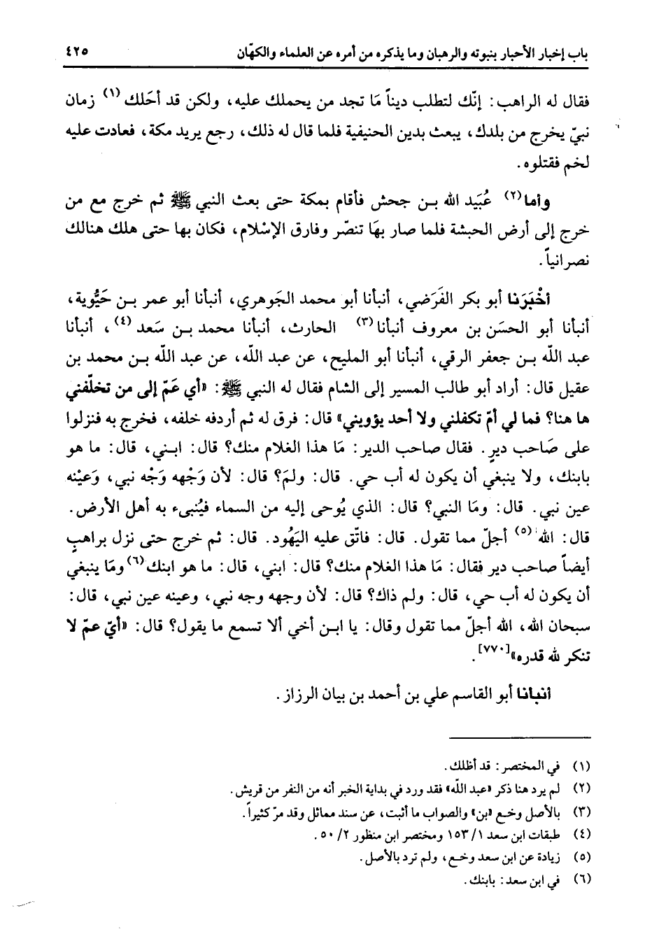 فقال له الراهب إنك لتطلب دينا ما تجد من يحملك عليه ولكن قد أحلك (1) زمان نبي يخرج من بلدك يبعث بدين الحنيفية فلما قال له ذلك رجع يريد مكة فعادت عليه لخم فقتلوه وأما (2) عبيد الله بن جحش فأقام بمكة حتى بعث النبي (صلى الله عليه وسلم) ثم خرج مع من خرج إلى أرض الحبشة فلما صار بها تنصر وفارق الإسلام فكان بها حتى هلك هنالك نصرانيا أخبرنا أبو بكر الفرضي أنبأنا أبو محمد الجوهري أنبأنا أبو عمر بن حيوية أنبأنا أبو الحسن بن معروف أنبأنا (3) الحارث أنبأنا محمد بن سعد (4) أنبأنا عبد الله بن جعفر الرقي أنبأنا أبو المليح عن عبد الله عن عبد الله بن محمد بن عقيل قال أراد أبو طالب المسير إلى الشام فقال له النبي (صلى الله عليه وسلم) أي عم إلى من تخلفني ها هنا فما لي أم تكفلني ولا أحد يؤويني قال فرق له ثم أردفه خلفه فخرج به فنزلوا على صاحب دير فقال صاحب الدير ما هذا الغلام منك قال ابني قال ما هو بابنك ولا ينبغي أن يكون له أب حي قال ولم قال لأن وجهه وجه نبي وعينه عين نبي قال وما النبي قال الذي يوحى إليه من السماء فينبئ به أهل الأرض قال الله (5) أجل مما تقول قال فاتق عليه اليهود قال ثم خرج حتى نزل براهب أيضا صاحب دير فقال ما هذا الغلام منك قال ابني قال ما هو ابنك (6) وما ينبغي أن يكون له أب حي قال ولم ذاك قال لأن وجهه وجه نبي وعينه عين نبي قال سبحان الله الله أجل مما تقول وقال يا ابن أخي ألا تسمع ما يقول قال أي عم لا تنكر لله قدره