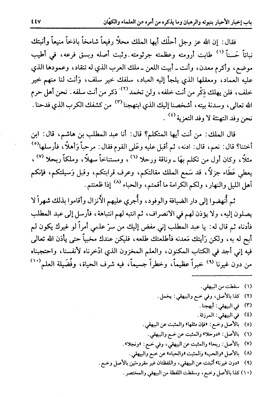 فقال إن الله عز وجل أحلك أيها الملك محلا رفيعا شامخا باذخا منيعا وأنبتك نباتا حسنا (1) طابت أرومته وعظمته جرثومته وثبت أصله وبسق فرعه في أطيب موضع وأكرم معدن وأنت أبيت اللعن ملك العرب الذي له تنقاد وعمودها الذي عليه العماد ومعقلها الذي يلجأ إليه العباد سلفك خير سلف وأنت لنا منهم خير خلف فلن يهلك ذكر من أنت خلفه ولن تخمد (2) ذكر من أنت سلفه نحن أهل حرم الله تعالى وسدنة بيته أشخصنا إليك الذي ابتهجنا (3) من كشفك الكرب الذي فدحنا نحن وفد التهنئة لا وفد التعزية (4) قال الملك من أنت أيها المتكلم قال أنا عبد المطلب بن هاشم قال ابن أختنا قال نعم قال ادنه ثم أقبل عليه وعلى القوم فقال مرحبا وأهلا فأرسلها (5) مثلا وكان أول من تكلم بها وناقة ورحلا (6) ومستناخا سهلا وملكا ربحلا (7) يعطي عطاء جزلا قد سمع الملك مقالتكم وعرف قرابتكم وقبل وسيلتكم فإنكم أهل الليل والنهار ولكم الكرامة ما أقمتم والحباء (8) إذا ظعنتم ثم أنهضوا إلى دار الضيافة والوفود وأجرى عليهم الإنزال وأقاوا بذلك شهرا لا يصلون إليه ولا يؤذن لهم في الانصراف ثم انتبه لهم انتباهة فأرسل إلى عبد المطلب فأدناه ثم قال له يا عبد المطلب إني مفض إليك سر علمي أمرا لو غيرك يكون لم أبح له به ولكن رأيتك معدنه فأطلعتك طلعه فليكن عندك مخبيا حتى يأذن الله تعالى فيه إني أجد في الكتاب المكنون والعلم المخزون الذي ادخرناه لأنفسنا واحتجبناه من دون غيرنا (9) خبرا عظيما وخطرا جسيما فيه شرف الحياة وفضيلة العلم