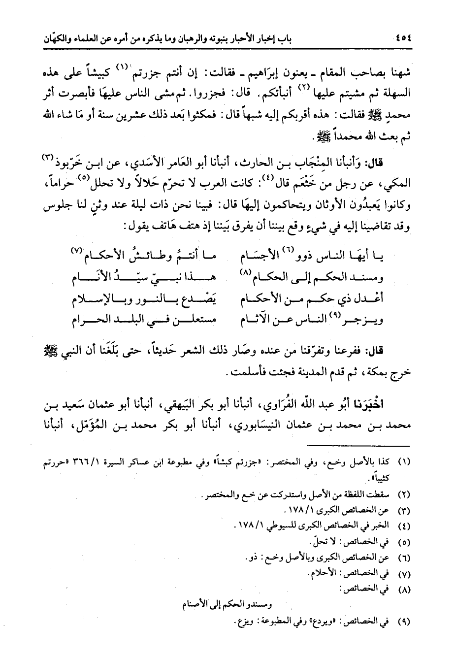 شهنا بصاحب المقام يعنون إبراهيم فقالت إن أنتم جزرتم (1) كبيشا على هذه السهلة ثم مشيتم عليها (2) أنبأتكم قال فجزروا ثم مشى الناس عليها فأبصرت أثر محمد (صلى الله عليه وسلم) فقالت هذه أقربكم إليه شبها قال فمكثوا بعد ذلك عشرين سنة أو ما شاء الله ثم بعث الله محمدا (صلى الله عليه وسلم) قال وأنبأنا المنجاب بن الحارث أنبأنا أبو العامر الأسدي عن ابن خربوذ (3) المكي عن رجل من خثعم قال (4) كانت العرب لا تحرم حلالا ولا تحلل (5) حراما وكانوا يعبدون الأوثان ويتحاكمون إليها قال فبينا نحن ذات ليلة عند وثن لنا جلوس وقد تقاضينا إليه في شئ وقع بيننا أن يفرق بيننا إذ هتف هاتف يقول * يا أيها الناس ذوو (6) الأجسام * ما أنتم وطائش الأحكام (7) ومسند الحكم إلى الحكام (8) * هذا نبي سيد الأنام أعدل ذي حكم من الأحكام * يصدع بالنور وبالإسلام ويزجر (9) الناس عن الآثام * مستعلن في البلالحرام
