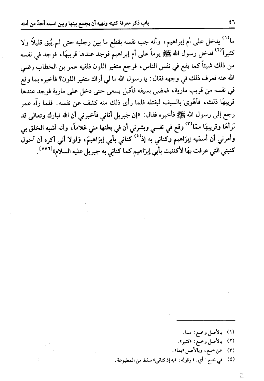 ما (1) يدخل على أم إبراهيم وأنه جب نفسه بقطع ما بين رجليه حتى لم يبق قليلا ولا كثيرا (2) فدخل رسول الله (صلى الله عليه وسلم) يوما على أم إبراهيم فوجد عندها قريبها فوجد في نفسه من ذلك شيئا كما يقع في نفس الناس فرجع متغير اللون فلقيه عمر بن الخطاب Bهـ فعرف ذلك في وجهه فقال يا رسول الله ما لي أراك متغير اللون فأخبره بما وقع في نفسه من قريب مارية فمضى بسيفه فاقبل يسعى حتى دخل على مارية فوجد عندها قريبها ذلك فأهوى بالسيف ليقتله فلما رأى ذلك منه كشف عن نفسه فلما رآه عمر رجع إلى رسول الله (صلى الله عليه وسلم) فأخبره فقال إن جبريل أتاني فأخبرني أن الله تبارك وتعالى قد برأها وقريبها مما (3) وقع في نفسي وبشرني أن في بطنها مني غلاما وأنه أشبه الخلق بي وأمرني أن أسميه إبراهيم وكناني به إذ (4) كناني بأبي إبراهيم ولولا أني أكره أن أحول كنيتي التي عرفت بها لأكتنيت بأبي إبراهيم كما كناني به جبريل عليه السلام