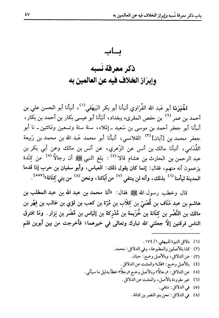 " باب ذكر معرفة نسبه وإبراز الخلاف فيه عن العالمين به " أخبرنا أبو عبد الله الفراوي أنبأنا أبو بكر البيهقي (1) أنبأنا أبو الحسن علي بن أحمد بن عمر (2) بن حفص المقرئ ببغداد أنبأنا أبو عيسى بكار بن أحمد بن بكار أنبأنا أبو جعفر أحمد بن موسى بن سعيد إملاء سنة ستة وتسعين ومائتين نا أبو جعفر محمد بن أبان (3) القلانسي أنبأنا أبو محمد عبد الله بن محمد بن ربيعة القدامي أنبأنا مالك بن أنس عن الزهري عن أنس بن مالك وعن أبي بكر بن عبد الرحمن بن الحارث بن هشام قالا (4) بلغ النبي (صلى الله عليه وسلم) أن رجالا (5) من كندة يزعمون أنه منهم فقال إنما كان يقول ذلك العباس وأبو سفيان بن حرب إذا قدما المدينة ليأمنا (6) بذلك وأنه لن ينتفي (7) من آبائنا ونحن (8) من بني كنانة