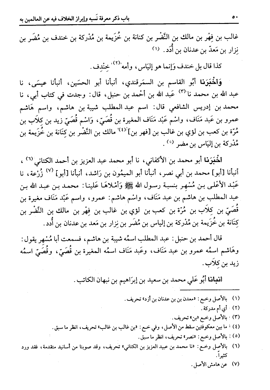 فهر بن مالك بن النضر بن كنانة بن خزيمة بن مدركة بن خندف بن مضر بن نزار بن معد بن عدنان بن أدد (1) كذا قال بل خندف وإنما هو إلياس وأمه (2) خندف وأخبرنا أبو القاسم بن السمرقندي أنبأنا أبو الحسين أنبأنا عيسى نا عبد الله بن محمد نا (3) عبد الله بن أحمد بن حنبل قال وجدت في كتاب أبي نا محمد بن إدريس الشافعي قال اسم عبد المطلب شيبة بن هاشم واسم هاشم عمرو بن عبد مناف واسم عبد مناف المغيرة بن قصي واسم قصي زيد بن كلاب بن مرة بن كعب بن لؤي بن غالب بن فهر بن (4) مالك بن النضر بن كنانة بن خزيمة بن مدركة بن إلياس بن مضر (5) أخبرنا أبو محمد بن الأكفاني نا أبو محمد عبد العزيز بن أحمد الكتاني (6) أنبأنا أبو محمد بن ابي نصر أنبأنا أبو الميمون بن راشد أنبأنا أبو (7) زرعة نا عبد الأعلى بن مسهر بنسبة رسول الله (صلى الله عليه وسلم) وأملاها علينا محمد بن عبد الله بن عبد المطلب بن هاشم بن عبد مناف واسم هاشم عمرو واسم عبد مناف مغيرة بن قصي بن كلاب بن مرة بن كعب بن لؤي بن غالب بن فهر بن مالك بن النضر بن كنانة بن خزيمة بن مدركة بن إلياس بن مضر بن نزار بن معد بن عدنان بن أدد قال أحمد بن حنبل عبد المطلب اسمه شيبة بن هاشم فسمعت أبا مسهر يقول وهاشم اسمه عمرو بن عبد مناف وعبد مناف اسمه المغيرة بن قصي وقصي اسمه زيد بن كلاب أنبأنا أبو علي محمد بن سعيد بن إبراهيم بن نبهان الكاتب