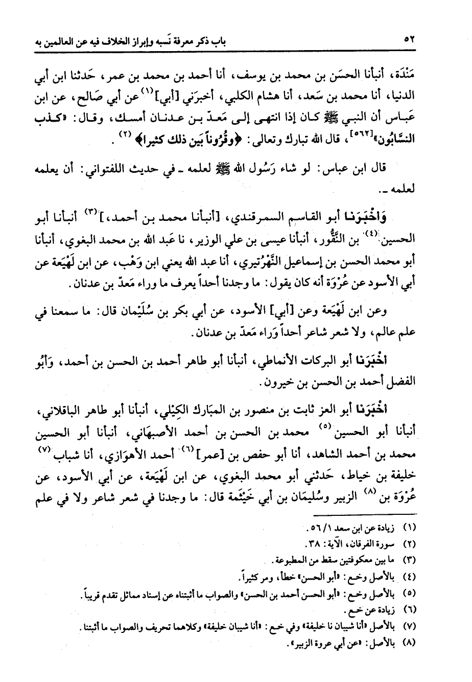 [562] قال الله تبارك وتعالى " وقرونا بين ذلك كثيرا " (2) قال ابن عباس لو شاء رسول الله (صلى الله عليه وسلم) لعلمه في حديث اللفتواني أن يعلمه لعلمه وأخبرنا أبو القاسم السمرقندي أنبأنا محمد بن أحمد (3) أنبأنا أبو الحسين (4) بن النقور أنبأنا عيسى بن علي الوزير نا عبد الله بن محمد البغوي أنبأنا أبو محمد الحسن بن إسماعيل النهرتيري أنا عبد الله يعني ابن وهب عن ابن لهيعة عن أبي الأسود عن عروة أنه كان يقول ما وجدنا أحدا يعرف ما وراء معد بن عدنان وعن ابن لهيعة وعن أبي الأسود عن أبي بكر بن سليمان قال ما سمعنا في علم عالم ولاشعر شاعر أحدا وراء معد بن عدنان أخبرنا أبو البركات الأنماطي أنبأنا أبو طاهر أحمد بن الحسن بن أحمد وأبو الفضل أحمد بن الحسن بن خيرون أخبرنا أبو العز ثابت بن منصور بن المبارك الكيلي أنبأنا أبو طاهر الباقلاني أنبأنا أبو الحسين (5) محمد بن الحسن بن أحمد الأصبهاني أنبأنا أبو الحسين محمد بن أحمد الشاهد أنا أبو حفص بن عمر (6) أحمد الأهوازي أنا شباب (7) خليفة بن خياط حدثني أبو محمد البغوي عن ابن لهيعة عن أبي الأسود عن عروة بن (8) الزبير وسليمان بن أبي خيثمة قال ما وجدنا في شعر شاعر ولا في علم