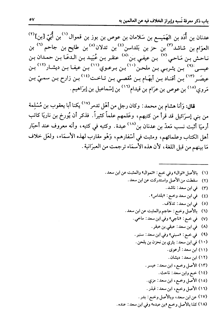 عدنان بن أدد بن الهميسع بن سلامان بن عوص بن بوز بن قموال (1) بن أبي بن (2) العوام بن شاشد (3) بن حز بن بلداسن (4) بن تدلان (5) بن طايح بن جاحم (6) بن ناحش بن ماحي (7) بن عيفي بن (8) عنقر بن عبيد بن الدعا بن حمدان بن عيسى (9) بن يثربي بن ملحن (10) بن برعوي (11) بن عيفا بن ديشار (12) بن عيصر (13) بن أقناد بن أبهام بن مقصي بن تاخت (14) بن زارح بن سمي بن مروي (15) بن عوص بن عرام بن قيدام (16) بن إسماعيل بن إبراهيم قال وأنا هشام بن محمد وكان رجل من أهل تدمر (17) يكنا أبا يعقوب بن مسلمة من بني إسرائيل قد قرأ من كتبهم وعلمهم علما كثيرا فذكر أن يورخ بن ناريا كاتب أرميا أثبت نسب معد بن عدنان بن (18) عبدة وكتبه في كتبه وأنه معروف عند أحبار أهل الكتاب وعلمائهم ومثبت في أسفارهم وهو مقارب لهذه الأسماء ولعل خلاف ما بينهم من قبل اللغة لأن هذه الأسماء ترجمت من العبرانية
