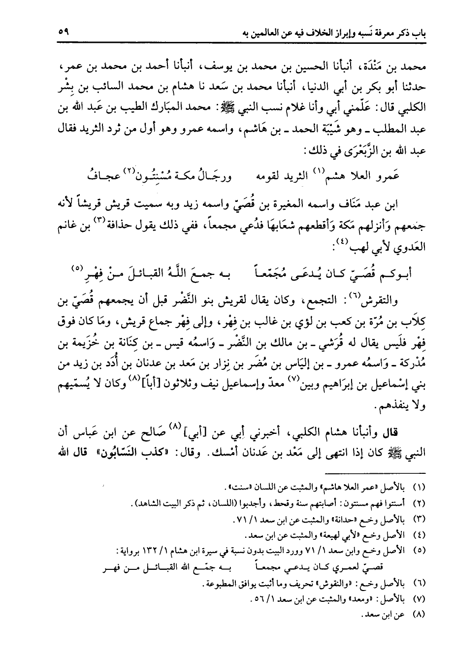 محمد بن مندة أنبأنا الحسين بن محمد بن يوسف أنبأنا أحمد بن محمد بن عمر حدثنا أبو بكر بن أبي الدنيا أنبأنا محمد بن سعد نا هشام بن محمد السائب بن بشر الكلبي قال علمني أبي وأنا غلام نسب النبي (صلى الله عليه وسلم) محمد المبارك الطيب بن عبد الله بن عبد المطلب وهو شيبة الحمد بن هاشم واسمه عمرو وهو أول من ثرد الثريد فقال عبد الله بن الزبعري في ذلك عمرو العلا هشم (1) الثريد لقومه * ورجال مكة مسنتون (2) عجاف * ابن عبد مناف واسمه المغيرة بن قصي واسمه زيد وبه سميت قريش قريشا لأنه جمعهم وأنزلهم مكة وأقطعهم شعابها فدعي مجمعا ففي ذلك يقول حذافة (3) بن غانم العدوي لأبي لهب (4) أبوكم قصي كان يدعى مجمعا * به جمع الله القبائل من فهر 5 * والتقرش (6) التجمع وكان يقال لقريش بن النضر قبل أن يجمعهم قصي بن كلاب بن مرة بن كعب بن لؤي بن غالب بن فهر وإلى فهر جماع قريش وما كان فوق فهر فليس يقال له قرشي بن مالك بن النضر واسمه قيس بن كنانة بن خزيمة بن مدركة واسمه عمرو بن إلياس بن مضر بن نزار بن معد بن عدنان بن أدد بن زيد من بني إسماعيل بن إبراهيم وبين (7) معد وإسماعيل نيف وثلاثون أبا (8) وكان لا يسميهم ولا ينفذهم قال وأنبأنا هشام الكلبي أخبرني أبي عن أبي (8) صالح عن ابن عباس أن النبي (صلى الله عليه وسلم) كان إذا انتهى إلى معد بن عدنان أمسك وقال كذب النسابون قال الله