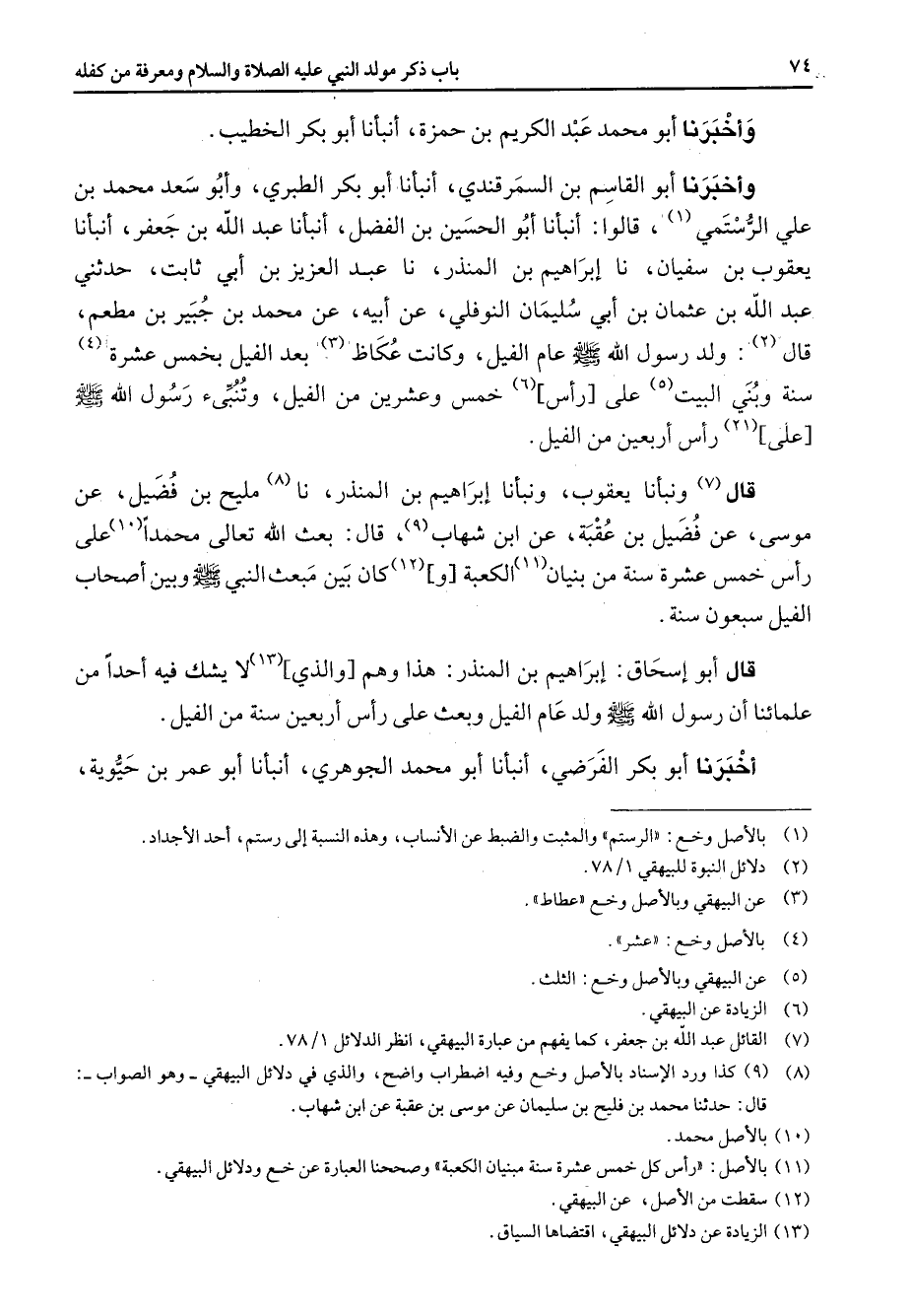 وأخبرنا أبو محمد عبد الكريم بن حمزة أنبأنا أبو بكر الخطيب وأخبرنا أبو القاسم بن السمرقندي أنبأنا أبو بكر الطبري وأبو سعد محمد بن علي الرستمي (1) قالوا أنبأنا أبو الحسين بن الفضل أنبأنا عبد الله بن جعفر أنبأنا يعقوب بن سفيان نا إبراهيم بن المنذر نا عبد العزيز بن أبي ثابت حدثني عبد الله بن عثمان بن أبي سليمان النوفلي عن أبيه عن محمد بن جبير بن مطعم قال (2) ولد رسول الله (صلى الله عليه وسلم) عام الفيل وكانت عكاظ (3) بعد الفيل بخمس عشرة (4) سنة وبني البيت (5) على رأس (6) خمس وعشرين من الفيل وتنبئ رسول الله (صلى الله عليه وسلم) على (21) رأس أربعين من الفيل قال (7) ونبأنا يعقوب ونبأنا إبراهيم بن المنذر نا (8) مليح بن فضيل عن موسى عن فضيل بن عقبة عن ابن شهاب (9) قال بعث الله تعالى محمدا (10) على رأس خمس عشرة سنة من بنيان (11) الكعبة و (12) كان بين مبعث النبي (صلى الله عليه وسلم) وبين أصحاب الفيل سبعون سنة قال أبو إسحاق إبراهيم بن المنذر هذا وهم والذي (13) لا يشك فيه أحدا من علمائنا أن رسول الله (صلى الله عليه وسلم) ولد عام الفيل وبعث على رأس أربعين سنة من الفيل أخبرنا أبو بكر الفرضي أنبأنا أبو محمد الجوهري أنبأنا أبو عمر بن حيوية