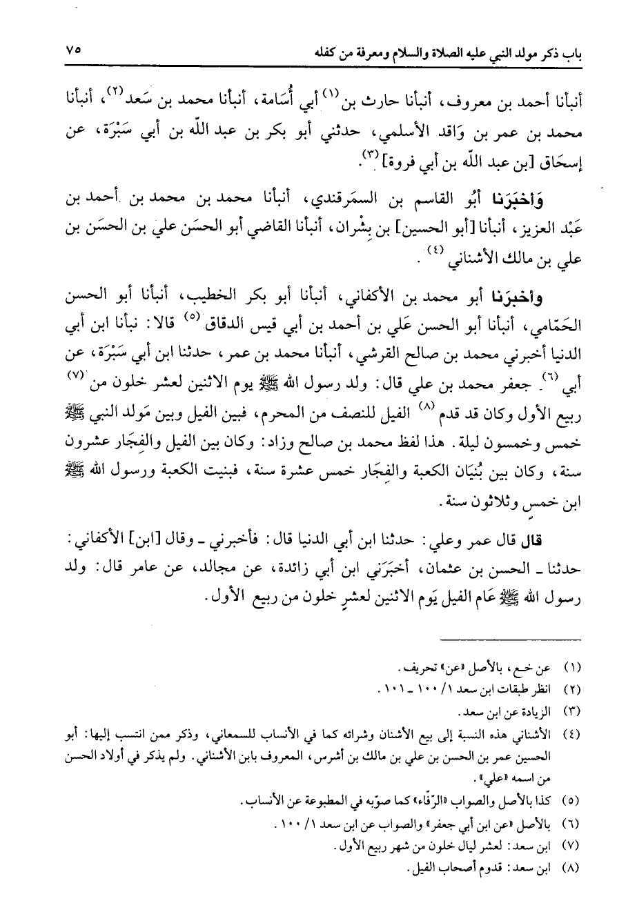 أنبأنا أحمد بن معروف أنبأنا حارث بن (1) أبي أسامة أنبأنا محمد بن سعد (2) أنبأنا محمد بن عمر بن واقد الأسلمي حدثني أبو بكر بن عبد الله بن أبي سبرة عن إسحاق بن عبد الله بن أبي فروة (3) وأخبرنا أبو القاسم بن السمرقندي أنبأنا محمد بن محمد بن أحمد بن عبد العزيز أنبأنا أبو الحسين بن بشران أنبأنا القاضي أبو الحسين علي بن الحسن بن علي بن مالك الأشناني (4) وأخبرنا أبو محمد بن الأكفاني أنبأنا أبو بكر الخطيب أنبأنا أبو الحسن الحمامي أنبأنا أبو الحسن علي بن أحمد بن أبي قيس الدقاق (5) قالا نبأنا ابن أبي الدنيا أخبرني محمد بن صالح القرشي أنبأنا محمد بن عمر حدثنا ابن أبي سبرة عن أبي (6) جعفر محمد بن علي قال ولد رسول الله (صلى الله عليه وسلم) يوم الاثنين لعشر خلون من (7) ربيع الأول وكان قد قدم (8) الفيل للنصف من المحرم فبين الفيل وبين مولد النبي (صلى الله عليه وسلم) خمس وخمسون ليلة هذا لفظ محمد بن صالح وزاد وكان بين الفيل والفجار عشرون سنة وكان بين بنيان الكعبة والفجار خمس عشرة سنة فبنيت الكعبة ورسول الله (صلى الله عليه وسلم) ابن خمس وثلاثون سنة قال قال عمر وعلي حدثنا ابن أبي الدنيا قال فأخبرني وقال ابن الأكفاني حدثنا الحسن بن عثمان أخبرني ابن أبي زائدة عن مجالد عن عامر قال ولد رسول الله (صلى الله عليه وسلم) عام الفيل يوم الاثنين لعشر خلون من ربيع الأول