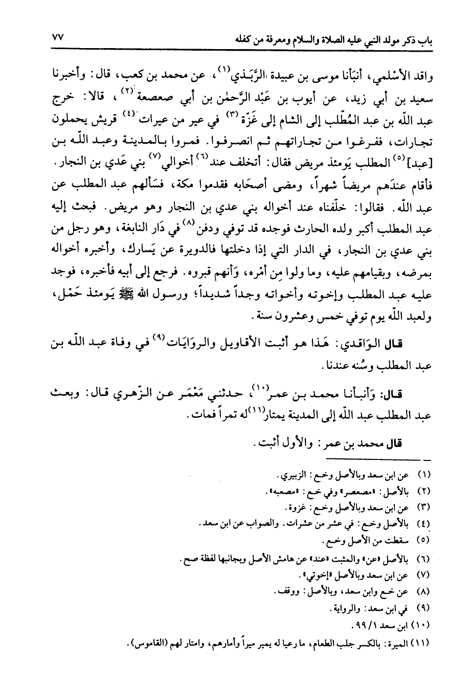 أنبأنا موسى بن عبيدة الربذي (1) عن محمد بن كعب قال وأخبرنا سعيد بن أبي زيد عن أيوب بن عبد الرحمن بن أبي صعصعة (2) قالا خرج عبد الله بن عبد المطلب إلى الشام إلى غزة (3) في عير من عيرات (4) قريش يحملون تجارات ففرغوا من تجاراتهم ثم انصرفوا فمروا بالمدينة وعبد الله بن عبد (5) المطلب يومئذ مريض فقال أتخلف عند (6) أخوالي (7) بني عدي بن النجار فأقام عندهم مريضا شهرا ومضى أصحابه فقدموا مكة فسألهم عبد المطلب عن عبد الله فقالوا خلفناه عند أخواله بني عدي بن النجار وهو مريض فبعث إليه عبد المطلب أكبر ولده الحارث فوجده قد توفي ودفن (8) في دار النابغة وهو رجل من بني عدي بن النجار في الدار التي إذا دخلتها فالدويرة عن يسارك وأخبره أخواله بمرضه وبقيامهم عليه وما ولوا من أمره وأنهم قبروه فرجع إلى أبيه فأخبره فوجد عليه عبد المطلب وأخوته وأخواته وجدا شديدا ورسوله الله (صلى الله عليه وسلم) يومئذ حمل ولعبد الله يوم توفي خمس وعشرون سنة قال الواقدي هذا هو أثبت الأقاويل والروايات (9) في وفاة عبد الله بن عبد المطلب وسنه عندنا قال وأنبأنا محمد بن عمر (10) حدثني معمر عن الزهري قال وبعث عبد المطلب عبد الله إلى المدينة يمتار (11) له تمرا فمات قال محمد بن عمر والأول أثبت