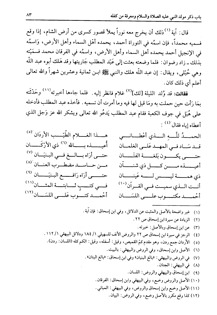 قال آية (1) ذلك أن يخرج معه نورا يملأ قصور كسرى من أرض الشام إذا وقع فسميه محمدا فإن اسمه في التوراة أحمد يحمده أهل السماء وأهل الأرض واسمه في الإنجيل أحمد يحمده أهل السماء وأهل الأرض واسمه في الفرقان محمد فسميته بذلك زاد رضوان فلما وضعته بعثت إلى عبد المطلب جاريتها وقد هلك أبوه عبد الله وهي حبلى ويقال إن عبد الله هلك والنبي (صلى الله عليه وسلم) ابن ثمانية وعشرين شهرا والله تعالى أعلم أي ذلك كان فقالت قد ولد الليلة لك (2) غلام فانظر إليه فلما جاءها أخبرته (11) وحدثته بما رأت حين حملت به وما قيل لها فيه وما أمرت أن تسميه فأخذه عبد المطلب فأدخله على هبل في جوف الكعبة فقام عبد المطلب يدعو الله تعالى ويشكر الله عز وجل الذي أعطاه إياه فقال (4) * الحمد لله الذي أعطاني * هذا الغلام الطيب الأردان (5) قد ساد في المهد على الغلمان * أعيذه بالله (6) ذي الأركان حتى يكو بلغة الفتان * حتى أراه بالغ في البنيان (7) أعيذه من كل ذي شنآن * من حاسد مضطرب العنان (8) ذي همة ليس له عينان * حتى أراه رافع البنيان (9) أنت الذي سميت في القرآن (10) * في كتب ثابتة المثان (11) أحمد مكتوب على اللسان * أحمد كتوب على اللسان (12) *