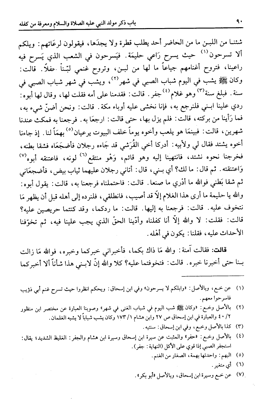 شئنا من اللبن ما من الحاضر أحد يطلب قطرة ولا يجدها فيقولون لرعاتهم ويلكم ألا تسرحون (1) حيث يسرح راعي حليمة فيسرحون في الشعب الذي يسرح فيه راعينا فتروح أغنامهم جياعا ما لها من لبن وتروح غنمي لبنا حفلا قالت وكان (صلى الله عليه وسلم) يشب في اليوم شباب الصبي في شهر (2) ويشب في شهر شباب الصبي في سنة فبلغ سنة (3) وهو غلام (4) جفر قال ت فقدمنا على أمه قلت لها وقال لها أبوه ردي علينا ابني فلنرجع به فإنا نخشى عليه أوباء مكة قالت ونحن أضن شئ به فما رأينا من بركته قالت فلم يزل بها حتى قالت ارجعا به فرجعنا به فمكث عندنا شهرين قالت فبينما هو يلعب وأخوه يوما خلف البيوت يرعيان (5) بهما لنا إذ جاءنا أخوه يشتد فقال لي ولأبيه أدركا أخي القرشي قد جاءه رجلان فأضجعاه فشقا بطنه فخرجنا نحوه نشتد فانتهينا إليه وهو قائم وهو (6) منتقلونه فاعتنقه أبوه (7) واعتنقته ثم قال ما لك أي بني قال أتاني رجلان عليهما ثياب بيض فأضجعاني ثم شقا بطني فوالله ما أدري ما صنعا قالت فاحتملناه فرجعنا به قالت يقول أبوه والله يا حليمة ما أرى هذا الغلام إلا قد أصيب فانطلقي فلنرده إلى أهله قبل أن يظهر ما نتخوف عليه قالت فرجعنا به إليها قالت ما ردكما وقد كنتما حريصين عليه قالت فقلت لا والله إلا أنا كفلناه وأدينا الحق الذي يجب علينا فيه ثم تخوفنا الأحداث عليه فقلنا يكون في أهله قالت فقالت آمنة والله ما ذاك بكما فأخبراني خبركما وخبره فوالله ما زالت بنا حتى أخبرنا خبره قالت فتخوفتما عليه كلا والله إن لابني هذا شأنا ألا أخبركما