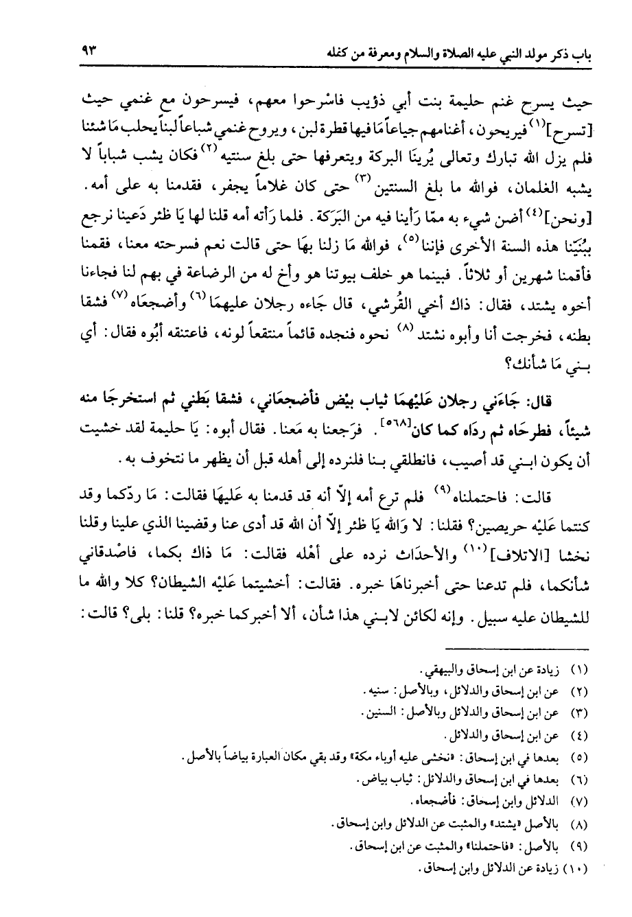 حيث يسرح غنم حليمة بنت أبي ذؤيب فاسرحوا معهم فيسرحون مع غنمي حيث تسرح (1) فيريحون أغنامهم جياعا ما فيها قطرة لبن ويروح غنمي شباعا لبنا يحلب ما شئنا فلم يزل الله تبارك وتعالى يرينا البركة ويتعرفها حتى بلغ سنتيه (2) فكان يشب شبابا لا يشبه الغلمان فوالله ما بلغ السنتين (3) حتى كان غلاما يجفر فقدمنا به على أمه ونحن (4) أضن شئ به مما رأينا فيه من البركة فلما رأته أمه قلنا لها يا ظئر دعينا نرجع ببنينا هذه السنة الأخرى فإننا (5) فوالله ما زلنا بها حتى قالت نعم فسرحته معنا فقمنا فأقمنا شهرين أو ثلاثا فبينما هو خلف بيوتنا هو وأخ له من الرضاعة في بهم لنا فجاءنا أخوه يشتد فقال ذاك أخي القرشي قال جاءه رجلان عليهما (6) وأضجعاه (7) فشقا بطنه فخرجت أنا وأبوه نشتد (8) نحوه فنجده قائما منتقعا لونه فاعتنقه أبوه فقال أي بني ما شأنك قال جاءني رجلان عليهما ثياب بيض فأضجعاني فشقا بطني ثم استخرجا منه شيئا فطرحاه ثم رداه كما كان