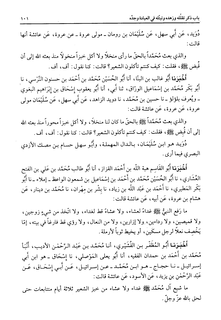 دويد عن أبي سهل عن سليمان بن رومان مولى عروة عن عروة عن عائشة أنها قالت والذي بعث محمدا بالحق ما رأى منخلا ولا أكل خبزا منخولا منذ بعثه الله إلى أن قبض (صلى الله عليه وسلم) فقلت كيف كنتم تأكلون الشعير قالت كنا نقول أف أف أخبرنا أبو غالب بن البنا أنا أبو الحسين محمد بن أحمد بن حسنون النرسي نا أبو بكر محمد بن إسماعيل الوراق ثنا أبي أنا أبو يعقوب إسحاق بن إبراهيم البغوي ويعرف بلؤلؤ نا حسين بن محمد نا دويد الزاهد عن أبي سهل عن سليمان مولى عروة عن عروة عن عائشة قالت والذي بعث محمدا (صلى الله عليه وسلم) بالحق ما كان لنا منخلا ولا أكل خبزا محورا منذ بعثه الله إلى أن قبض (صلى الله عليه وسلم) فقلت كيف كنتم تأكلون الشعير قالت كنا نقول أف أف دويد هو ابن سليمان بالدال المهملة وأبو سهل حسام بن مصك الأزدي البصري فيما أرى أخبرنا أبو القاسم هبة الله بن أحمد القزاز أنا أبو طالب محمد بن علي بن الفتح العشاري نا أبو الحسين محمد بن أحمد بن إسماعيل بن شمعون الواعظ إملاء نا أبو بكر المطيري نا أحمد بن عبد الله بن زياد نا بشر بن مهران نا محمد بن دينار عن هشام بن عروة عن أبيه عن عائشة قالت مار فع النبي (صلى الله عليه وسلم) غداء لعشاء ولا عشاء قط لغداء ولا اتخذ من شئ زوجين ولا قميصين ولا رداءين ولا إزارين ولا من النعال ولا رؤي قط فارغا في بيته إما يخصف نعلا لرجل مسكين أو يخيط ثوبا لأرملة أخبرنا أبو المظفر بن القشيري أنا محمد بن عبد الرحمن الأديب أنبأ محمد بن أحمد بن حمدان الفقيه أنا أبو يعلى الموصلي نا إسحاق هو ابن أبي إسرائيل نا حجاج هو ابن محمد عن إسرائيل عن أبي إسحاق عن عبد الرحمن بن يزيد عن الأسود عن عائشة قالت ما شبع آل محمد (صلى الله عليه وسلم) غداء ولا عشاء من خبز الشعير ثلاثة أيام متتابعات حتى لحق بالله عز وجل
