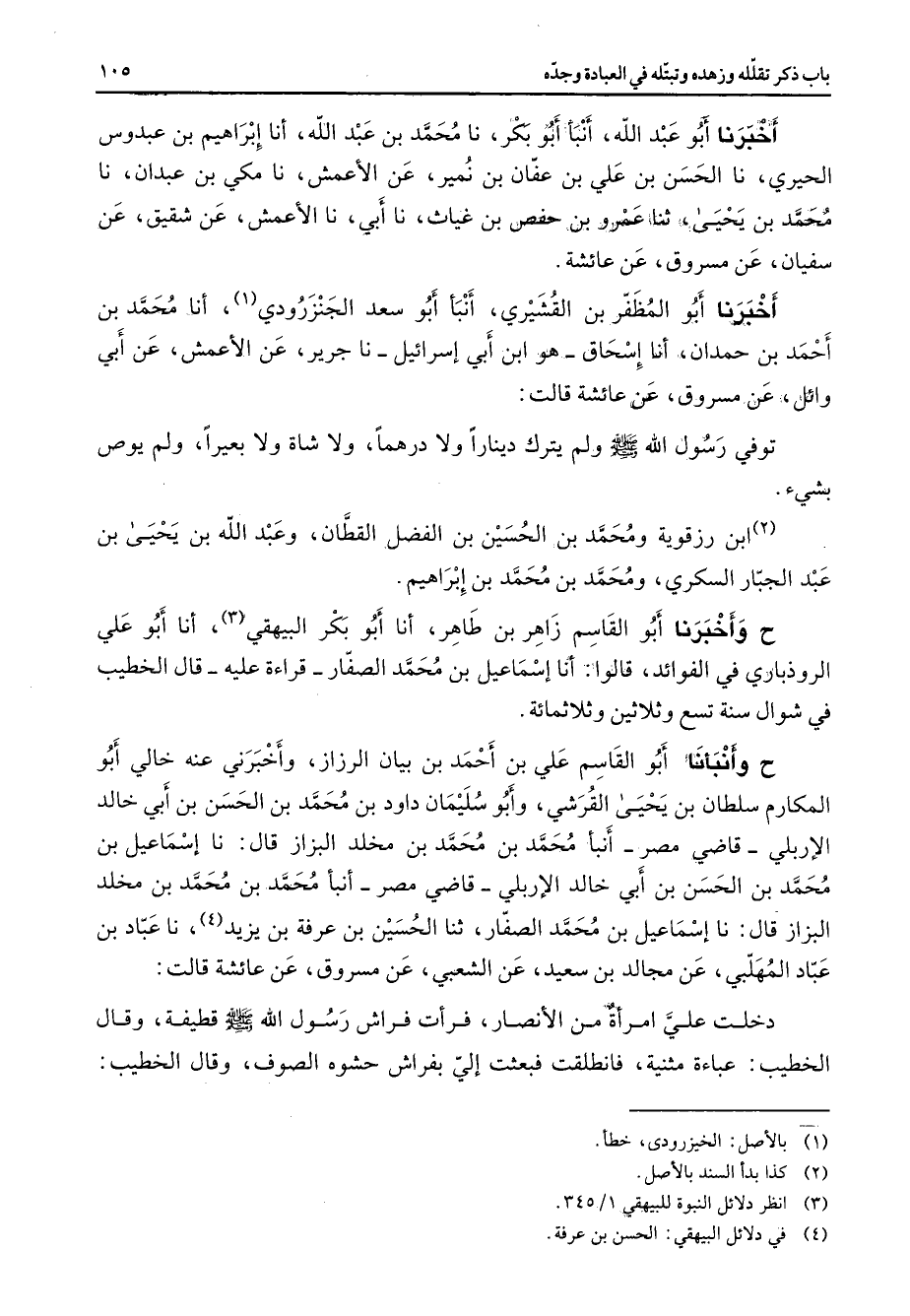 أخبرنا أبو عبد الله أنبأ أبو بكر نا محمد بن عبد الله أنا إبراهيم بن عبدوس الحيري نا الحسن بن علي بن عفان بن نمير عن الأعمش نا مكي بن عبدان نا محمد بن يحيى ثنا عمرو بن حفص بن غياث نا أبي نا الأعمش عن شقيق عن سفيان عن مسروق عن عائشة أخبرنا أبو المظفر بن القشيري أنبأ أبو سعد الجنزرودي (1) أنا محمد بن أحمد بن حمدان أنا إسحاق هو ابن أبي إسرائيل نا جرير عن الأعمش عن أبي وائل عن مسروق عن عائشة قالت توفي رسول الله (صلى الله عليه وسلم) ولم يترك دينارا ولا درهما ولا شاة ولا بعيرا ولم يوص بشئ (2) ابن رزقوية ومحمد بن الحسين بن الفضل القطان وعبد الله بن يحيى بن عبد الجبار السكري ومحمد بن محمد بن إبراهيم ح وأخبرنا أبو القاسم زاهر بن طاهر أنا أبو بكر البيهقي (3) أنا أبو علي الروذباوي في الفوائد قالوا أنا إسماعيل بن محمد الصفار قراءة عليه قال الخطيب في شوال سنة تسع وثلاثين وثلاثمائة ح وأنبأنا أبو القاسم علي بن أحمد بن بيان الرزاز وأخبرني عنه خالي أبو المكارم سلطان بن يحيى القرشي وأبو سليمان داود بن محمد بن الحسن بن أبي خالد الإربلي قاضي مصر أنبأ محمد بن محمد بن مخلد البزاز قال نا إسماعيل بن محمد بن الحسن بن أبي خالد الإربلى قاضي مصر أنبأ محمد بن محمد بن مخلد البزار قال نا إسماعيل بن محمد الصفار ثنا الحسين بن عرفة بن يزيد (4) نا عباد بن عباد المهلبي عن مجالد بن سعيد عن الشعبي عن مسروق عن عائشة قالت دخلت علي امرأة من الأنصار فرأت فراش رسول الله (صلى الله عليه وسلم) قطيفة وقال الخطيب عباءة مثنية فانطلقت فبعثت إلي بفراش حشوه الصوف وقال الخطيب