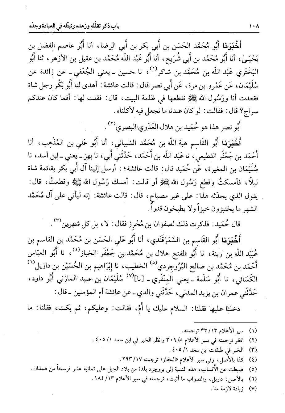 أخبرنا أبو محمد الحسن بن أبي بكر بن أبي الرضا أنا أبو عاصم الفضل بن يحيى أنا أبو محمد بن أبي شريح أنا أبو عبد الله محمد بن عقيل ين الأزهر ثنا أبو البختري عبد الله بن محمد بن شاكر (1) نا حسين يعني الحعفي عن زائدة عن سليمان عن عمرو بن مرة عن أبي نصر قال قالت عائشة أهدى لنا أبو بكر رجل شاة فقعدت أنا ورسول الله (صلى الله عليه وسلم) نقطعها في ظلمة البيت قال فقلت لها أفما كان عندكم سراج قال فقالت لو كان عندنا ما نجعل فيه لأكلناه أبو نصر هذا هو حميد بن هلال العدوي البصري (2) أخبرنا أبو القاسم هبة الله بن محمد الشيباني أنا أبو علي بن المذهب أنا أحمد بن جعفر القطيعي نا عبد الله بن أحمد حدثني أبي نا بهز يعني ابن أسد نا سليمان بن المغيرة عن حميد قال قالت عائشة أرسل إلينا آل أبي بكر بقائمة شاه ليلا فأمسكت وقطع رسول الله (صلى الله عليه وسلم) أو قالت أمسك رسول الله (صلى الله عليه وسلم) وقطعت قال يقول الذي يحدثه هذا على غير مصباح قال قالت عائشة إنه ليأتي على آل محمد الشهر ما يختبزون خبزا ولا يطبخون قدرا قال حميد فذكرت ذلك لصفوان بن محرز فقال لا بل كل شهرين (3) أخبرنا أبو القاسم بن السمرقندي أنا أبو علي الحسن بن محمد بن القاسم بن عبيد الله بن رينة نا أبو الفتح هلال بن محمد بن جعفر الخباز (4) نا أبو العباس أحمد بن محمد بن صالح البروجردي (5) الخطيب نا إبراهيم بن الحسين بن دازيل (6) الكسائي نا أبو سلمة يعني المنقري نا (7) سليمان بن عبيد المازني أبو داود حدثني عمران بن يزيد المدني حدثني والدي عن عائشة أم المؤمنين قال دخلنا عليها فقلنا السلام عليك يا أم فقالت وعليكم ثم بكت فقلنا ما