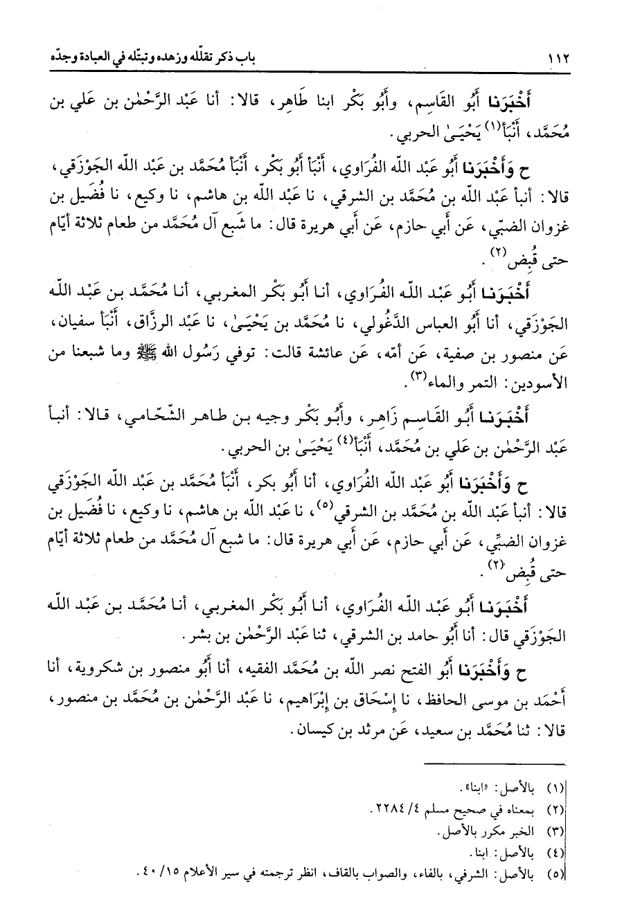 أخبرنا أبو القاسم وأبو بكر ابنا طاهر قالا أنا عبد الرحمن بن علي بن محمد أنبأ (1) يحيى الحربي ح وأخبرنا أبو عبد الله الفراوي أنبأ أبو بكر أنبأ محمد بن عبد الله الجوزقي قالا أنبأ عبد الله بن محمد بنالشرقي نا عبد الله بن هاشم نا وكيع نا فضيل بن غزوان الضبي عن أبي حازم عن أبي هريرة قال ما شبع آل محمد من طعام ثلاثة أيام حتى قبض (2) أخبرنا أبو عبد الله الفراوي أنا أبو بكر المغربي أنا محمد بن عبد الله الجوزقي أنا أبو العباس الدغولي نا محمد بن ليحي نا عبد الرزاق أنبأ سفيان عن منصور بن صفية عن أمه عن عائشة قالت توفي رسول الله (صلى الله عليه وسلم) وما شبعنا من الأسودين التمر والماء (3) أخبرنا أبو القاسم زاهر وأبو بكر وجيه بن طاهر الشحامي قالا أنبأ عبد الرحمن بن علي بن محمد أنبأ (4) يحيى بن الحربي ح وأخبرنا أبو عبد الله الفراوي أنا أبو بكر أنبأ محمد بن عبر الله الجوزقي قالا أنبأ عبد الله بن محمد بن الشرقي (5) نا عبد الله بن هاشم نا وكيع نا فضيل بن غزوان الضبي عن أبي حازم عن أبي هريرة قال ما شبع آل محمد من طعام ثلاثة أيام حتى قبض (2) أخبرنا أبو عبد الله الفراوي أنا أبو بكر المغربي أنا محمد بن عبد الله الجوزقي قال أنا أبو حامد بن الشرقي ثنا عبد الرحمن بن بشر ح وأخبرنا أبو الفتح نصر الله بن محمد الفقيه أنا أبو منصور بن شكروية أنا أحمد بن موسى الحافظ نا إسحاق بن إبراهيم نا عبد الرحمن بن محمد بن منصور قالا ثنا محمد بن سعيد عن مرثد بن كيسان