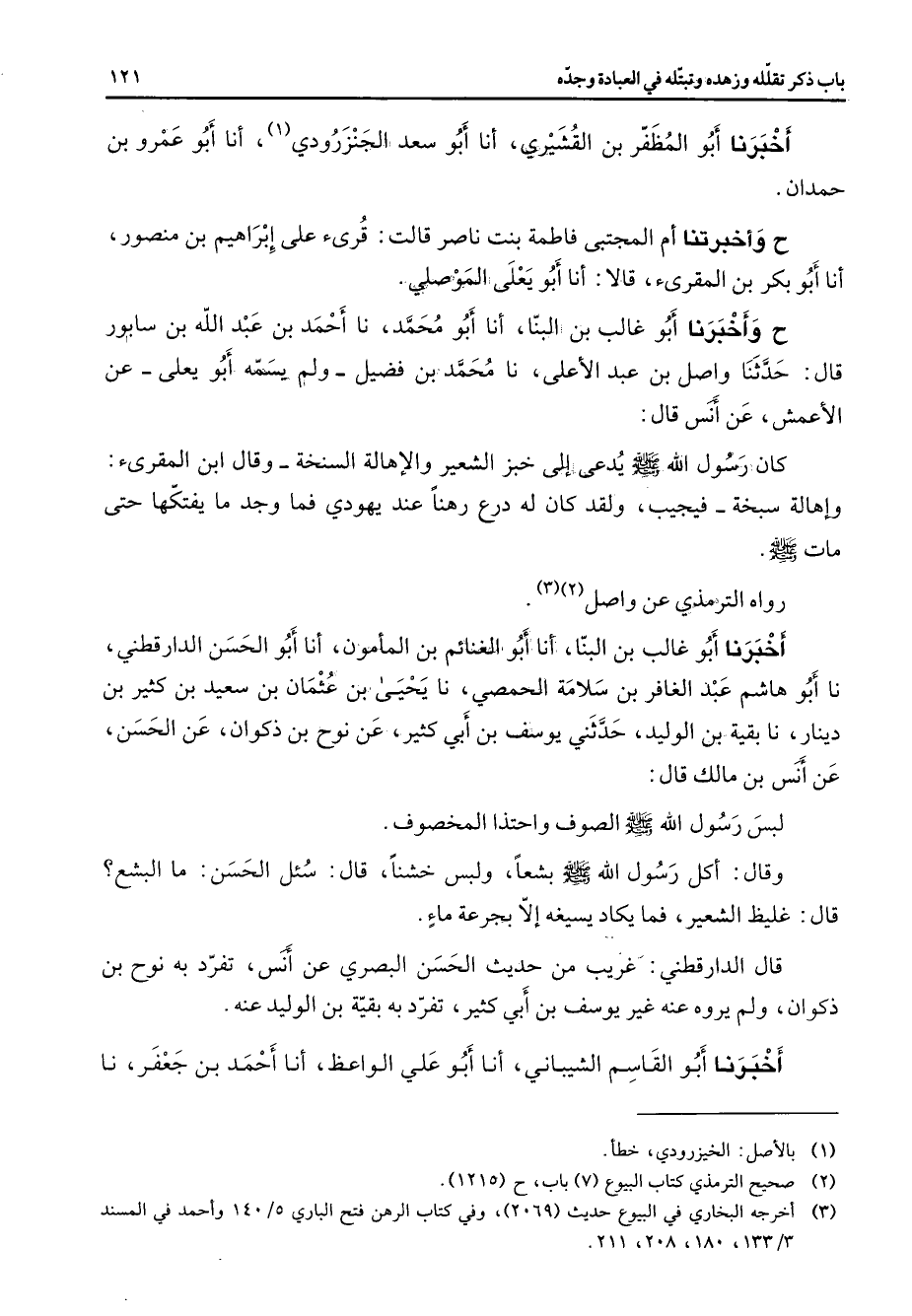 أخبرنا أبو المظفر بن القشيري أنا أبو سعد الجنزرودي (1) أنا أبو عمرو بن حمدان ح وأخبرتنا أم المجتبى فاطمة بنت ناصر قالت قرئ على إبراهيم بن منصور أنا أبو بكر بن المقرئ قالا أنا أبو يعلى الموصلي ح وأخبرنا أبو غالب بن البنا أنا أبو محمد نا أحمد بن عبد الله بن سابور قال حدثنا واصل بن عبد الأعلى نا محمد بن فضيل ولم يسمه أبو يعلى عن الأعمش عن أنس قال كان رسول الله (صلى الله عليه وسلم) يدعى إلى خبز الشعير والإهالة السنخة وقال ابن المقرئ وإهالة سبخة فيجيب ولقد كان له درع رهنا عند يهودي فما وجد ما يفتكها حتى مات (صلى الله عليه وسلم) رواه الترمذي عن واصل (2) (3) أخبرنا أبو غالب بن البنا أنا أبو الغنائم بن المأمون أنا أبو الحسن الدارقطني نا أبو هاشم عبد الغافر بن سلامة الحمصي نا يحيى بن عثمان بن سعيد بن كثير بن دينار نا بقية بن الوليد حدثني يوسف بن أبي كثير عن نوح بن ذكوان عن الحسن عن أنس بن مالك قال لبس رسول الله (صلى الله عليه وسلم) الصوف واحتذا المخصوف وقال أكل رسول الله (صلى الله عليه وسلم) بشعا ولبس خشنا قال سئل الحسن ما البشع قال غليظ الشعير فما يكاد يسيغه إلا بجرعة ماء قال الدارقطني غريب من حديث الحسن البصري عن أنس تفرد به نوح بن ذكوان ولم يروه عنه غير يوسف بن أبي كثير تفرد به بقية بن الوليد عنه أخبرنا أبو القاسم الشيباني أنا أبو علي الواعظ أنا أحمد بن جعفر نا