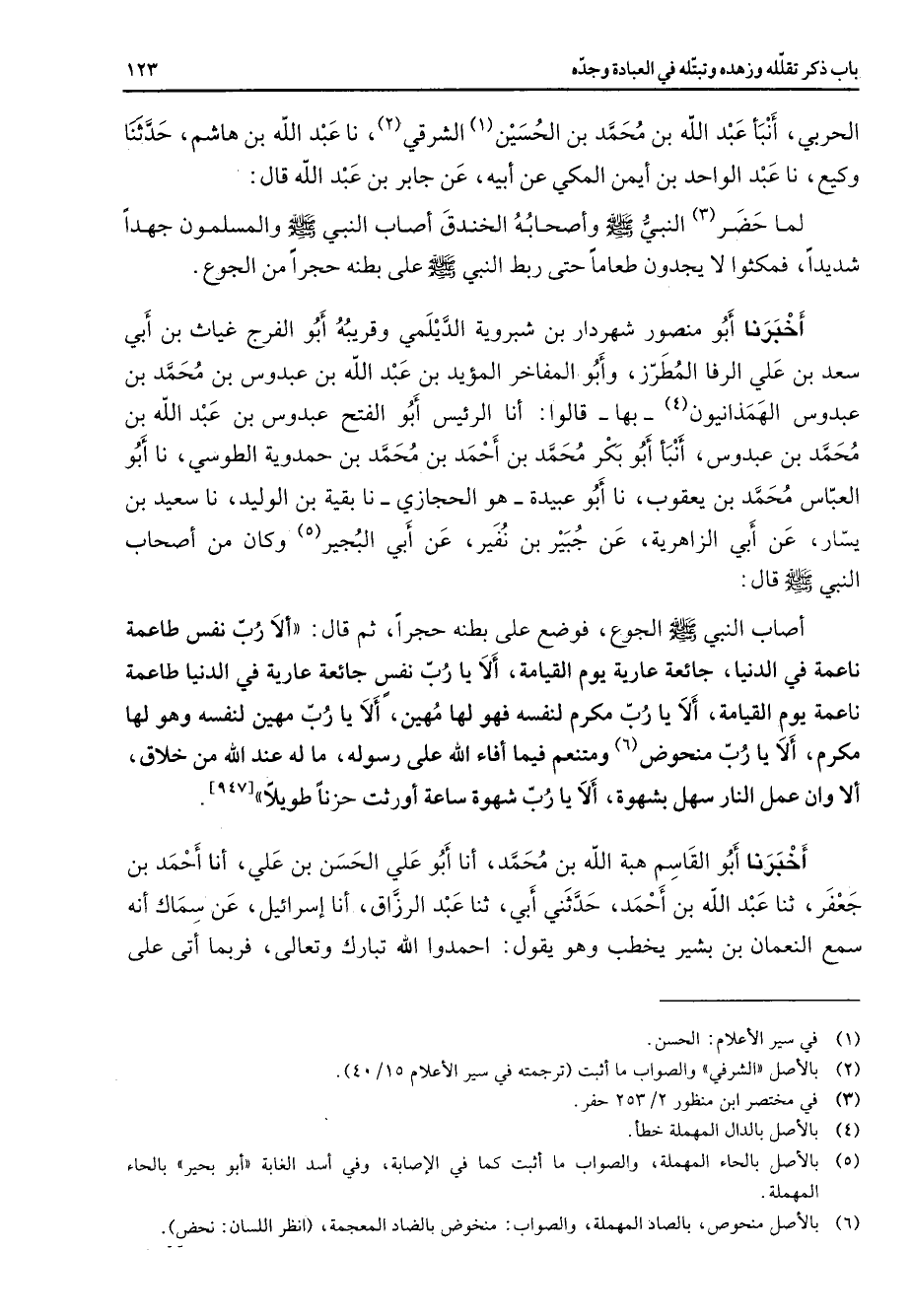 الحربي أنبأ عبد الله بن محمد بن الحسين (1) الشرقي (2) نا عبد الله بن هاشم حدثنا وكيع نا عبد الواحد بن أيمن المكي عن أبيه عن جابر بن عبد الله قال لما حضر (3) النبي (صلى الله عليه وسلم) وأصحابه الخندق أصاب النبي (صلى الله عليه وسلم) والمسلمون جهدا شديدا فمكثوا لا يجدون طعاما حتى ربط النبي (صلى الله عليه وسلم) على بطنه حجرا من الجوع أخبرنا أبو منصور شهر دار بن شبروية الديلمي وقريبه وأبو الفرج غياث بن أبي سعد بن علي الرفا المطرز وأبو المفاخر المؤيد بن عبد الله بن عبدوس بن محمد بن عبدوس الهمذانيون (4) بها قالوا أنا الرئيس أبو الفتح عبدوس بن عبد الله بن محمد بن عبدوس أنبأ أبو بكر محمد بن احمد بن محمد بن حمدويه الطوسي نا أبو العباس محمد بن يعقوب نا أبو عبيدة هو الحجازي نا بقية بن الوليد نا سعيد بن يسار عن أبي الزاهرية عن جبير بن نفير عن أبي البجير (5) وكان من أصحاب النبي (صلى الله عليه وسلم) قال أصاب النبي (صلى الله عليه وسلم) الجوع فوضع على بطنه حجرا ثم قال ألا رب نفس طاعمة ناعمة في الدنيا جائعة عارية يوم القيامة ألا يا رب نفس جائعة عارية في الدنيا طاعمة ناعمة يوم القيامة ألا يا رب مكرم لنفسه فهو لها مهين ألا يا رب مهين لنفسه وهو لها مكرم ألا يا رب منحوض (6) ومتنعم فيما أفاء الله على رسوله ما له عند الله من خلاق ألا وان عمل النار سهل بشهوة ألا يا رب شهوة ساعة أورثت حزنا طويلا