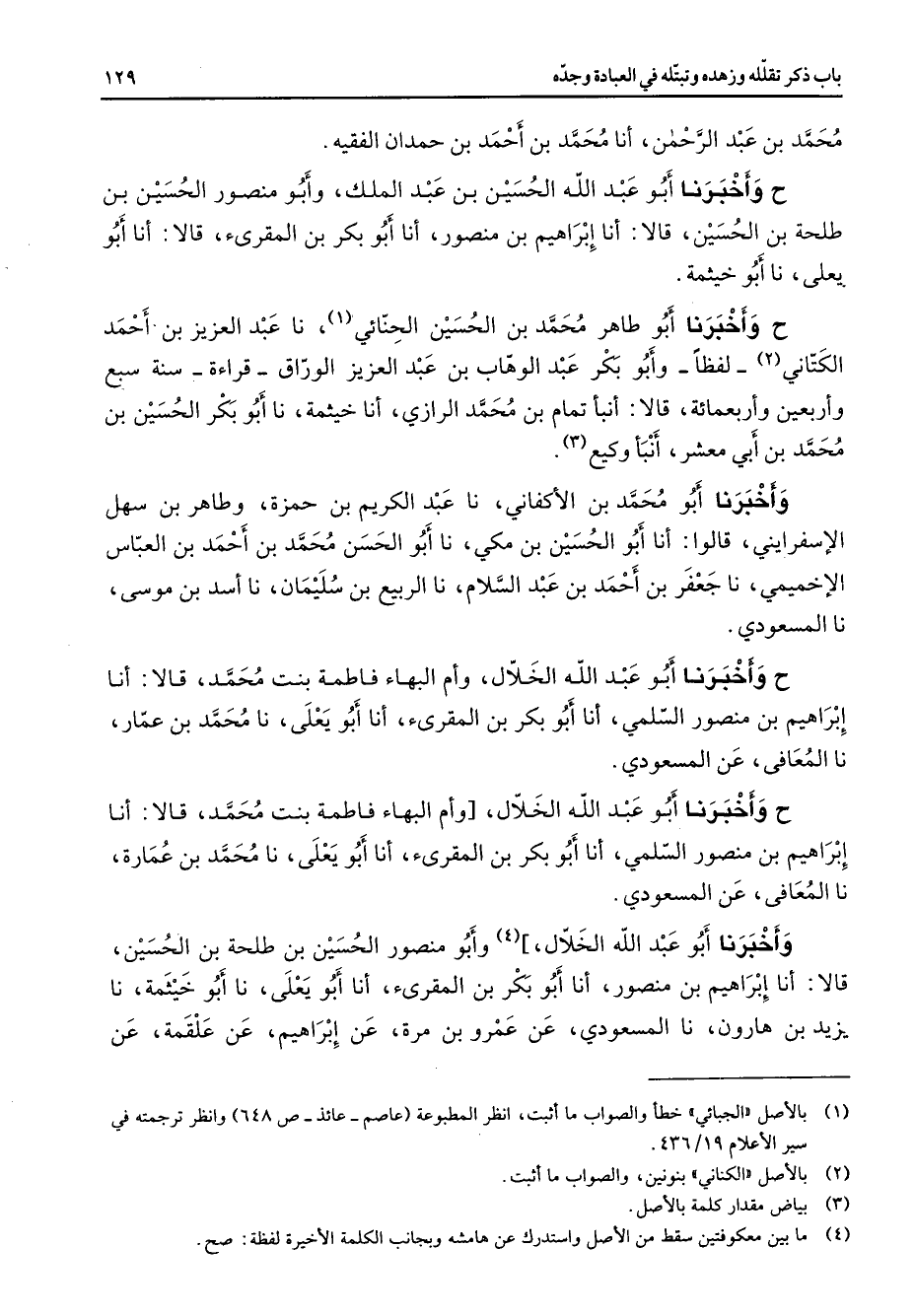 محمد بن عبد الرحمن أنا محمد بن أحمد بن حمدان الفقيه ح وأخبرنا أبو عبد الله الحسين بن عبد الملك وأبو منصور الحسين بن طلحة بن الحسين قالا أنا إبراهيم بن منصور أنا أبو بكر بن المقرئ قالا أنا أبو يعلي نا أبو خثيمة ح وأخبرنا أبو طاهر محمد بن الحسين الحنائي (1) نا عبد العزيز بن أحمد الكتاني (2) لفظا وأبو بكر عبد الوهاب بن عبد العزيز الوراق قراءة سنة سبع وأربعين وأربعمائة قالا أنبأ تمام بن محمد الرازي أنا خيثمة نا أبو بكر الحسين بن محمد بن أبي معشر أنبأ وكيع (3) واخبرنا أبو محمد بن الأكفاني نا عبد الكريم بن حمزة وطاهر بن سهل الإسفرايني قالوا أنا أبو الحسين بن مكي نا أبو الحسن محمد بن أحمد بن العباس الإخميمي نا جعفر بن أحمد بن عبد السلام نا الربيع بن سليمان نا أسد بن موسى نا المسعودي ح وأخبرنا أبو عبد الله الخلال وأم البهاء فاطمة بنت محمد قالا أنا إبراهيم بن منصور السلمي أنا أبو بكر بن المقرئ أنا أبو يعلى نا محمد بن عمار نا المعافى عن المسعودي ح وأخبرنا أبو عبد الله الخلال وأم البهاء فاطمة بنت محمد قالا أنا إبراهيم بن منصور السلمي أنا أبو بكر بن المقرئ أنا أبو يعلى نا محمد بن عمارة نا المعافى عن المسعودي وأخبرنا أبو عبد الله الخلال (4) وأبو منصور الحسين بن طلحة بن الحسين قالا أنا إبراهيم بن منصور أنا أبو بكر المقرئ أنا أبو يعلى نا أبو خيثمة نا يزيد بن هارون نا المسعودي عن عمرو بن مرة عن إبراهيم عن علقمة عن